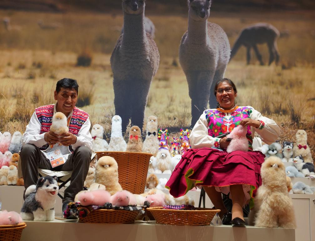 去年11月5日,在第六届中国国际进口博览会现场,秘鲁手工艺人马马尼夫妇现场制作羊驼玩偶。(图片来源:新华社)