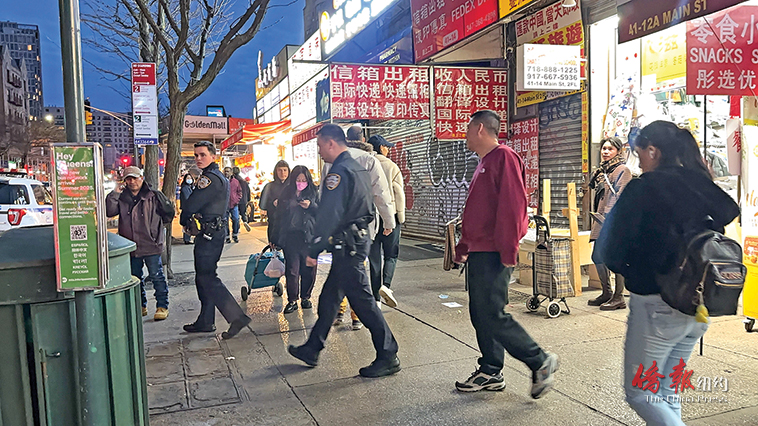 法拉盛缅街4112A号的店家被青少年劫匪多次滋扰,警方到场调查。(金玉贻摄)