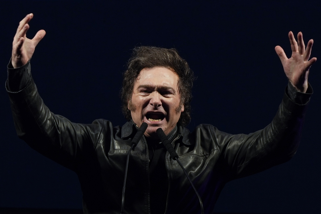 阿根廷总统哈维尔·米莱在一次集会上向支持者发表讲话。(美联社图)