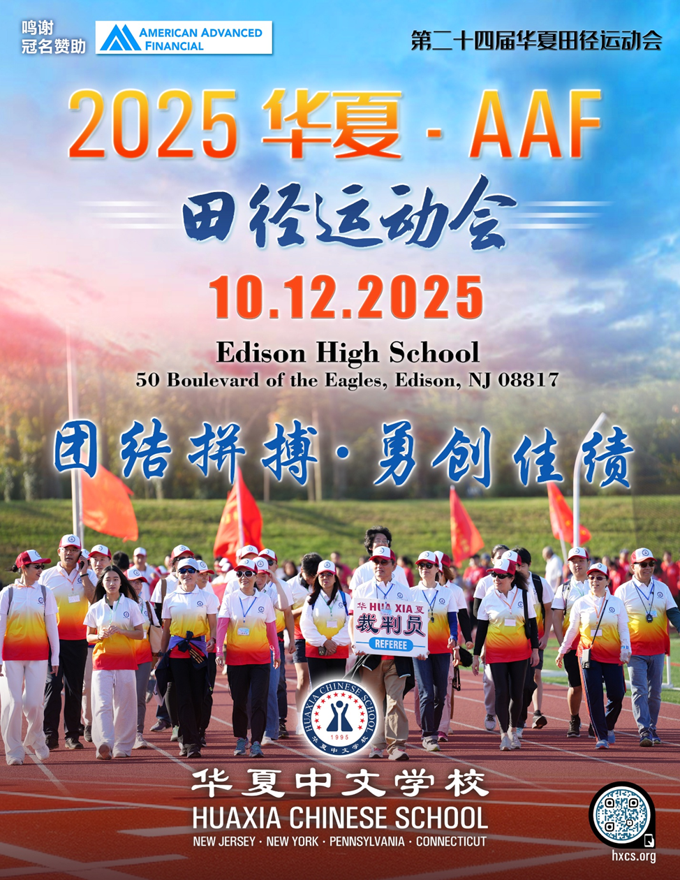 华夏中文学校将在新泽西州Edison High School(50 Boulevard of the Eagles, Edison, NJ 08817)隆重举行2025华夏-AAF田径运动会(暨第二十四届华夏田径运动会)。本届运动会时间为2025年10月12日(周日)上午9:00至下午4:30,上午9点举行开幕式,设有运动员入场式,并特别安排了舞龙和武术表演,营造热烈而庄重的氛围。届时,来自各分校的运动员、家长和志愿者们将齐聚一堂,共同见证这一年度体育盛事。