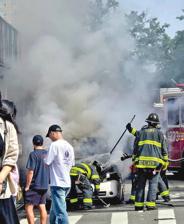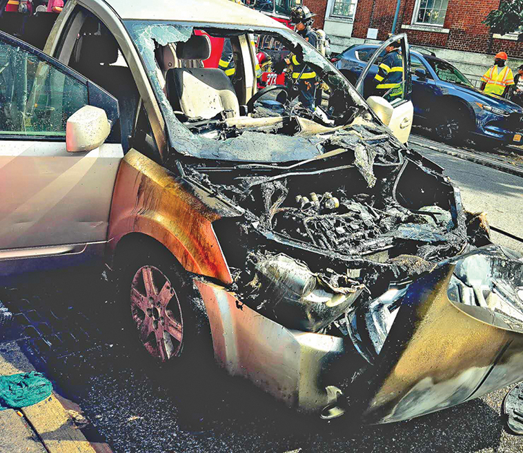 【侨报纽约讯】法拉盛缅街与三福大道路口30日下午发生一起车辆自燃事故,一辆停在街边的SUV被源自车头部位的大火彻底烧毁,引致众多民众围观。后消防人员到场,迅速将火扑灭。