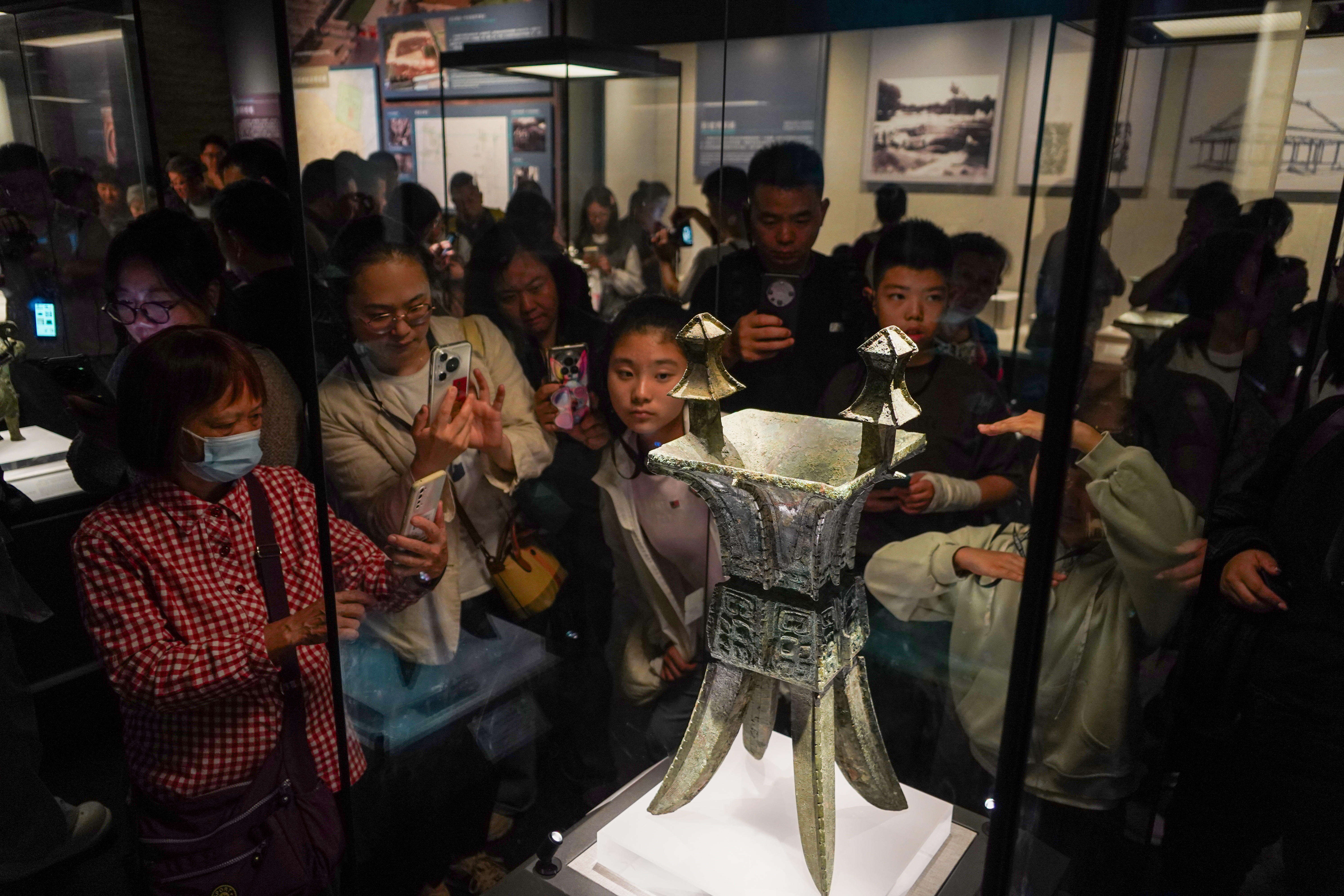 ▲10月1日,位于郑州的河南博物院迎来参观热潮。图为“妇好”铜方斝吸引游客驻足了解。 中新社