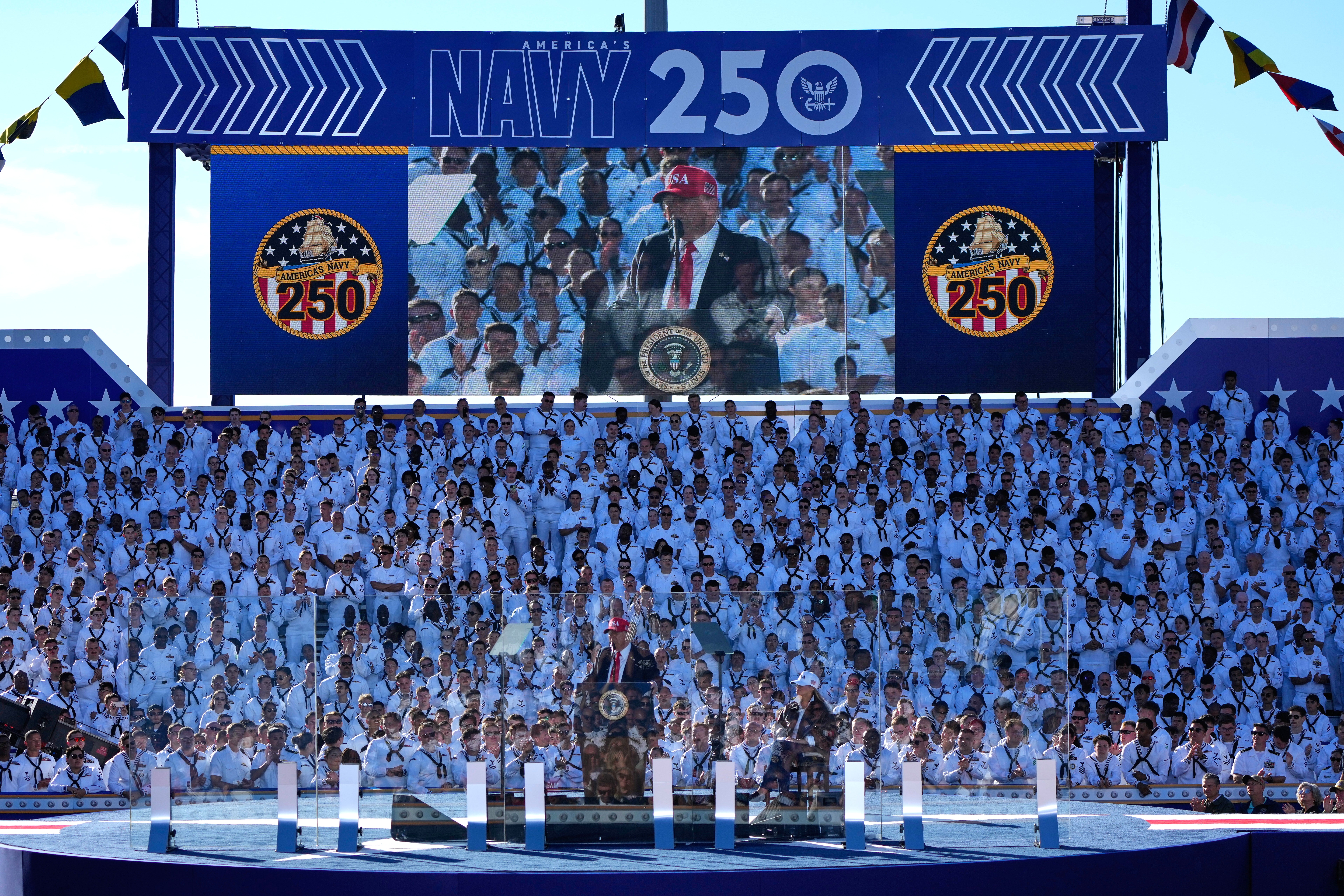 活动在两艘巨舰之间的码头举行,一侧是航空母舰“哈里·杜鲁门”号航母,另一侧为两栖攻击舰。约一万名身着白色礼服的海军官兵齐聚,战机低空掠过,人群高喊“U.S.A.! U.S.A.!”,气氛热烈。特朗普笑称:“老实说,这就是一场集会。”活动最后还播放了他的标志性歌曲《YMCA》,将海军250周年庆典作为集会的一部分。