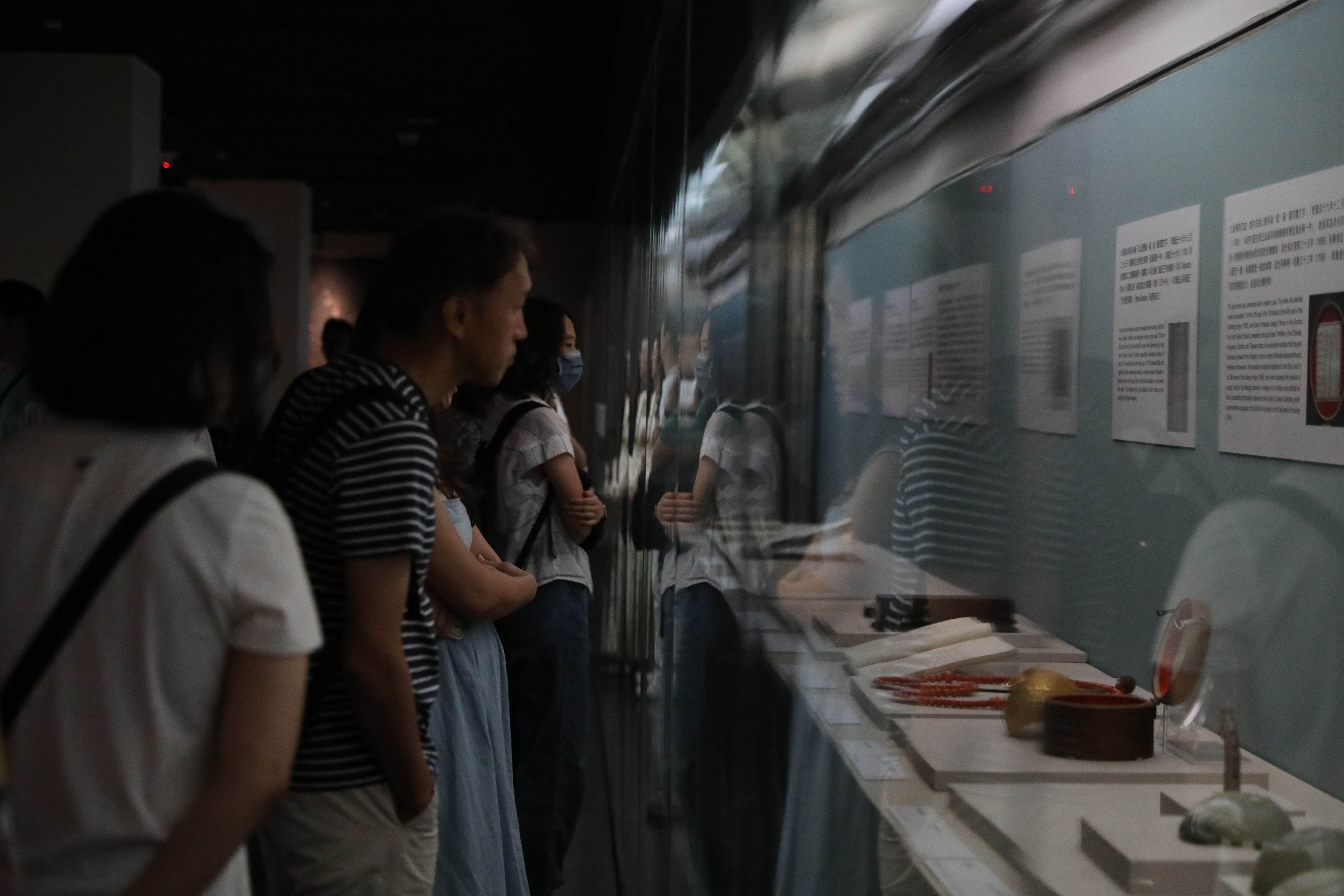 中新社报道,当天正值台湾中秋连假首日,不少民众前来观展。展览现场,《富春山居图》“无用师卷”和肉形石格外受青睐,展柜前人头攒动。
