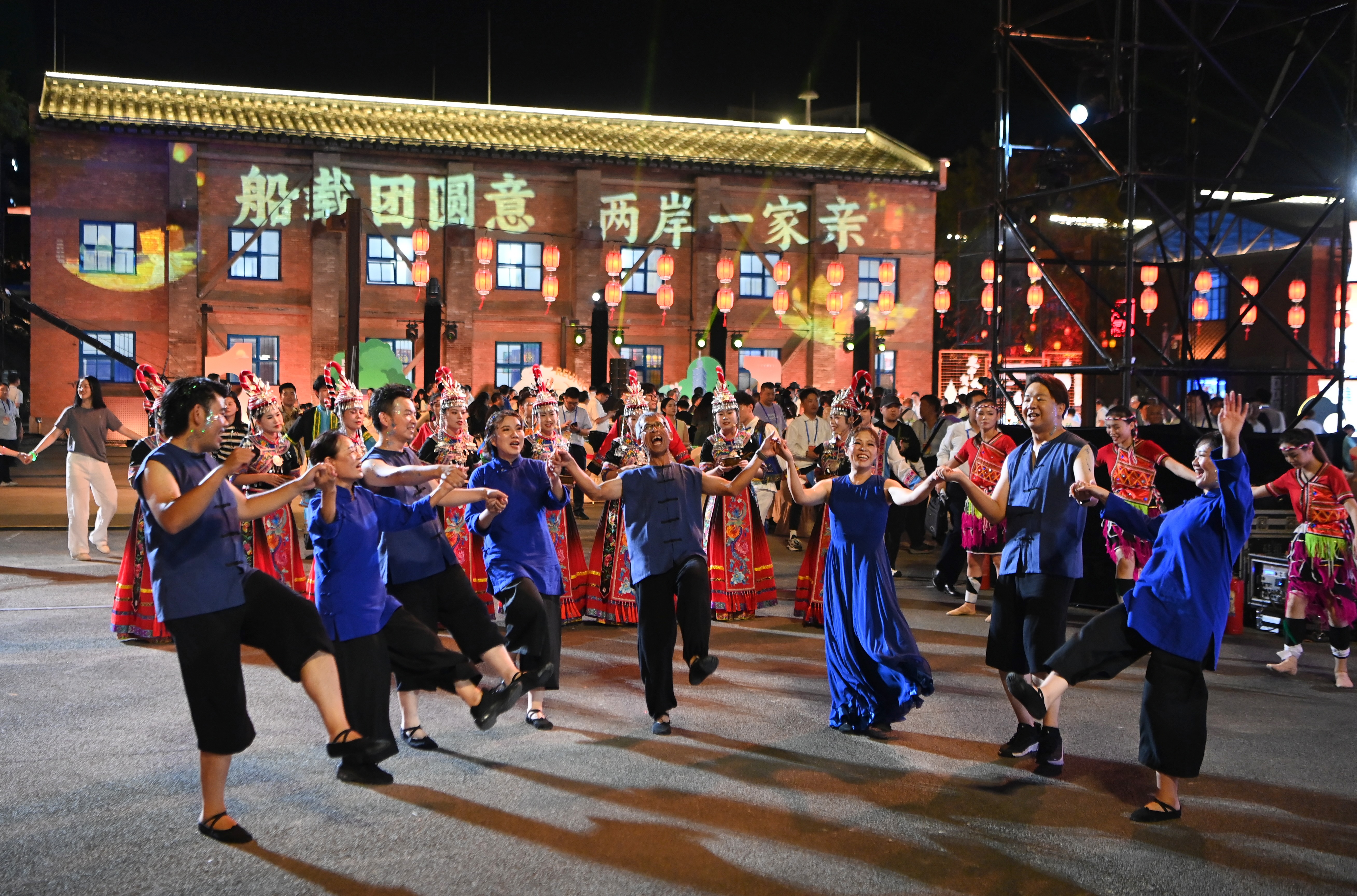 ▲10月4日晚,250余名两岸同胞在福建省福州市共同参加“福聚中秋月 ‘船’承两岸情”2025年两岸同胞迎中秋联谊活动。图为两岸同胞载歌载舞欢庆节日。中新社