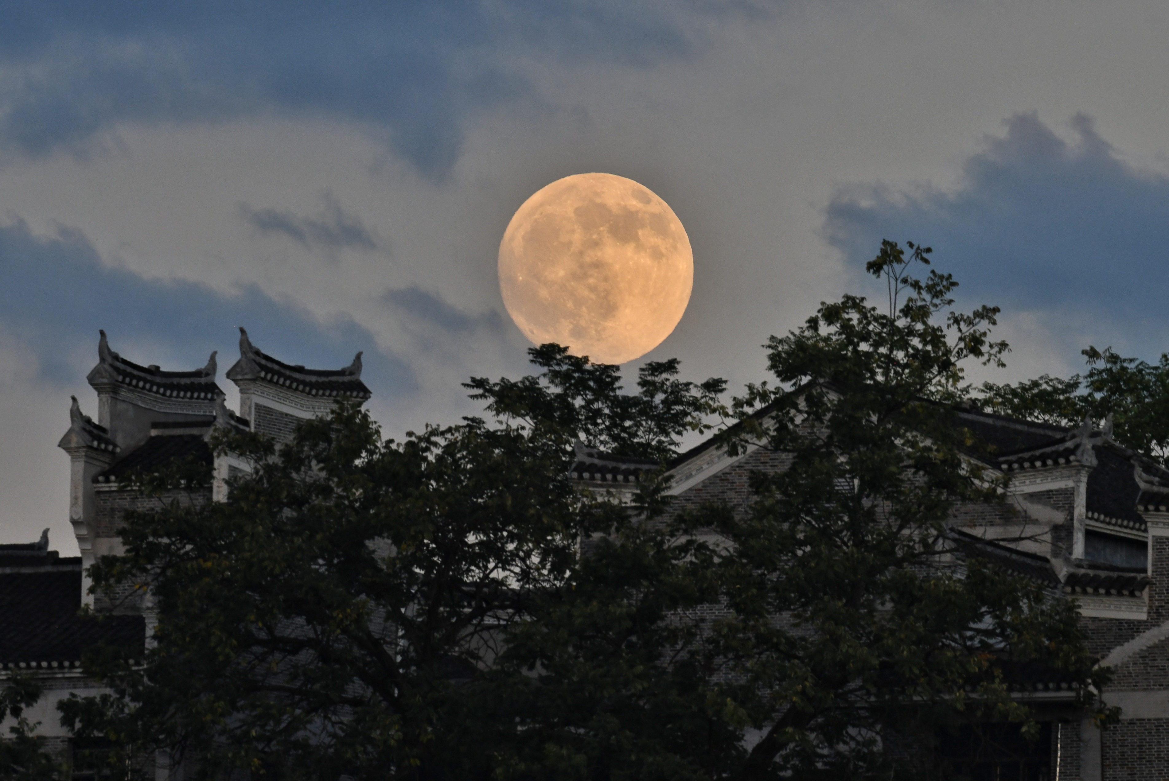 ▲10月6日,正值中秋佳节,湖南凤凰古城上空圆月高挂。中新社