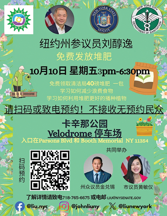 【侨报纽约讯】州参议员刘醇逸(John Liu)联合州众议员金兑锡(Ron Kim)与市议员黄敏仪(Sandra Ung)将于10日(周五)下午三点至六点半于卡辛那公园Velodrome停车场举行免费发放堆肥活动。有需要的民众需提前扫码或致电预约,活动不接受无预约民众。