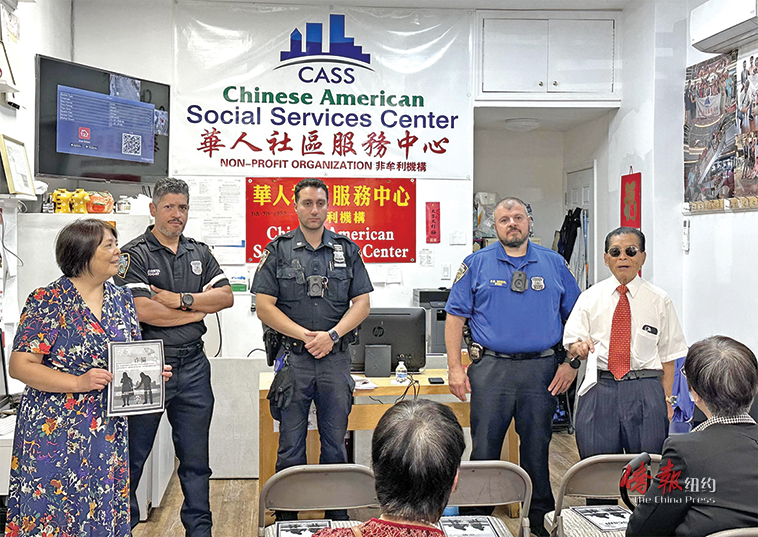 市警62分局预防犯罪警员阿科斯塔(P.O. Acosta)、社区事务警员诺戈尔(P.O.Nogol)以及安德雷亚尼警员(P.O. ANDREANI)7日前来华社服务中心会所,为长者介绍了近来肆虐的首饰骗抢案现状以及应对之策。