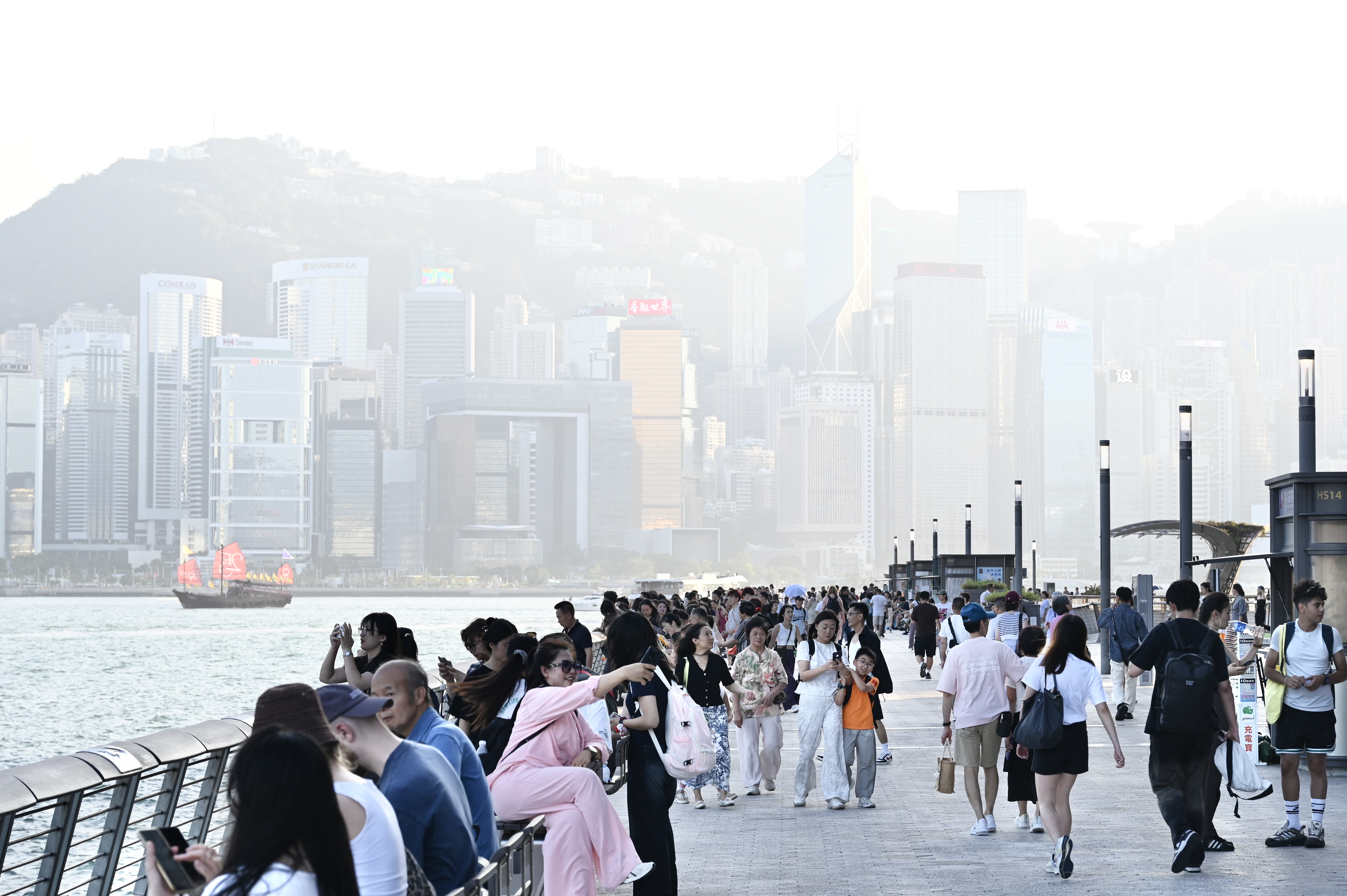 ▲10月8日是2025年中国内地“十一”国庆中秋8天长假最后一天。当天,不少游客在香港多地游玩,度过假期。图为游客在尖沙咀星光大道一带游玩。 中新社
