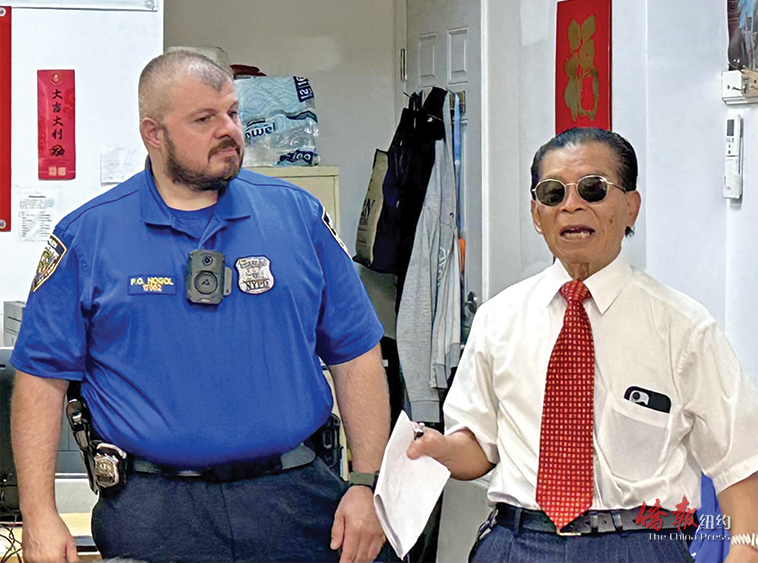 罗添福和警方在周二的安全讲座上介绍宾臣墟区发生的支票诈骗案。(崔国萁摄)
