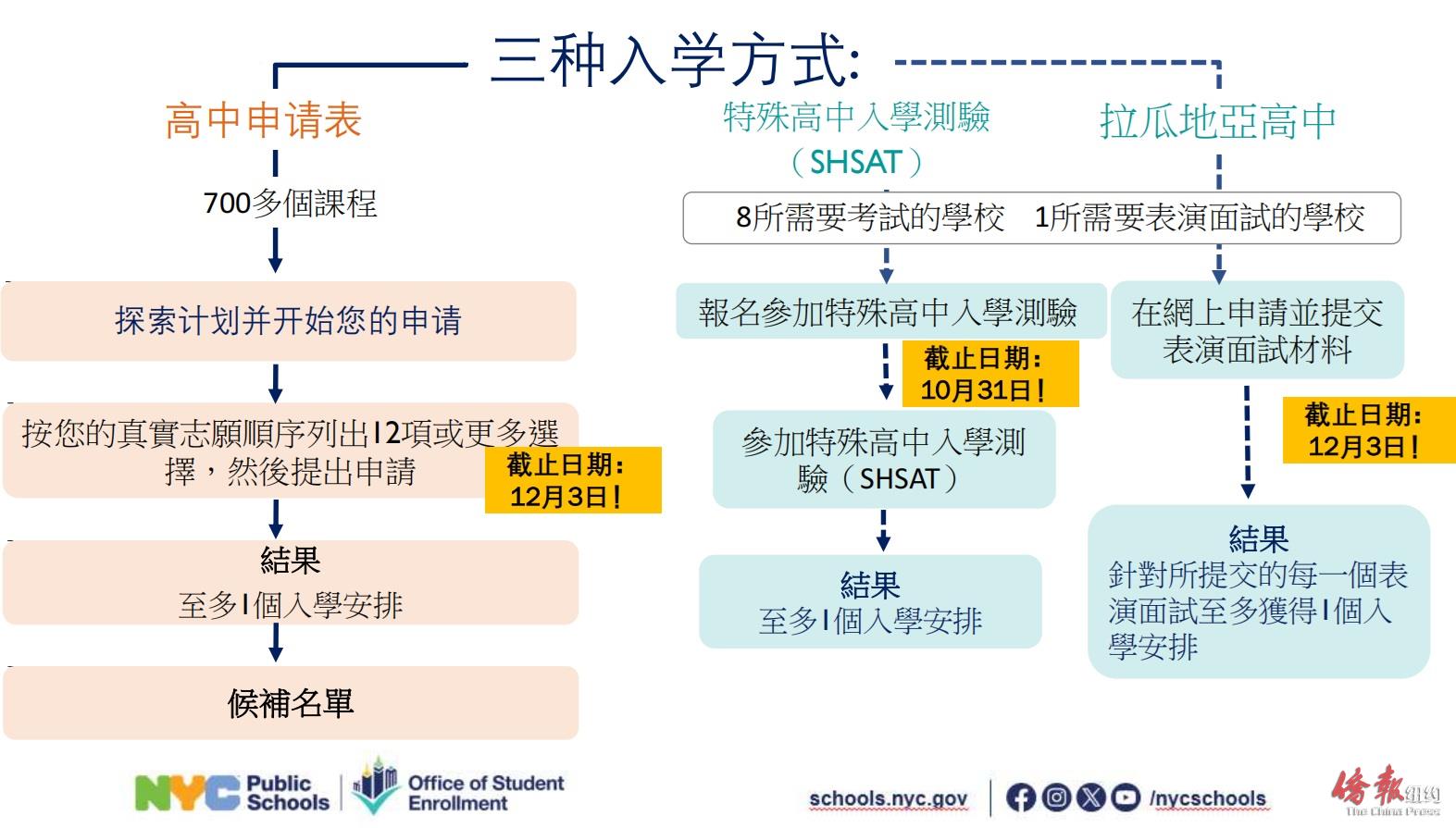 在特高中,8所要求SHSAT成绩,1所要求表演面试,即拉瓜迪亚艺术高中。注册已从本月7日开始,家庭可以在myschools.nyc上注册,或向学校工作人员寻求帮助。在10月7日至10月31日期间,需要列出最多8所测试的特殊高中的优先顺序,并且在注册截止日期前都能重新提交以修改排序。
