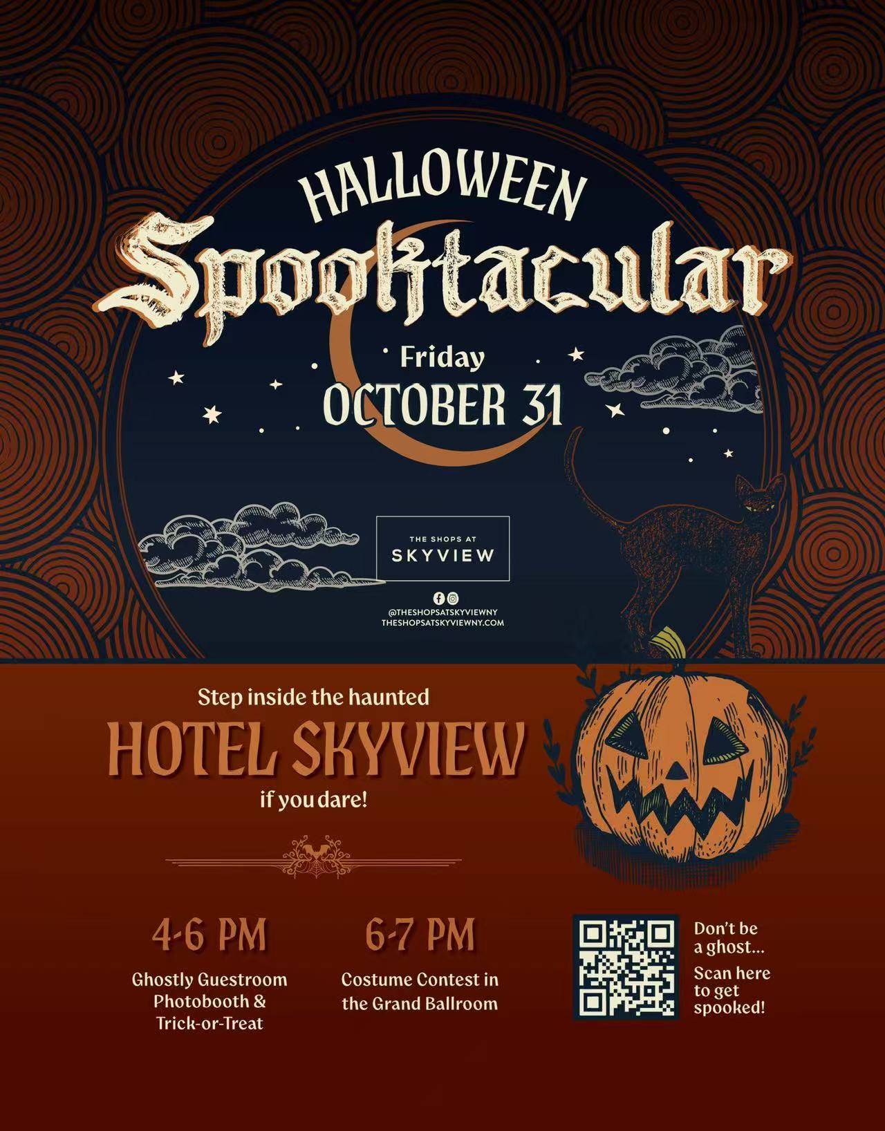 天景购物中心(The Shops at Skyview)将延续历年传统,于万圣节当日下午举办恐怖又热闹的万圣节活动,今年将以复古阴森的「天景酒店SKYVIEW HOTEL」为主题,从下午4点至晚上,与大小朋友们共度一年一度的万圣。活动当天商场四楼将变身成为「天景酒店」的大厅,欢迎穿着奇装异服的「旅客们」前来Check-in并留下纪念写真照。