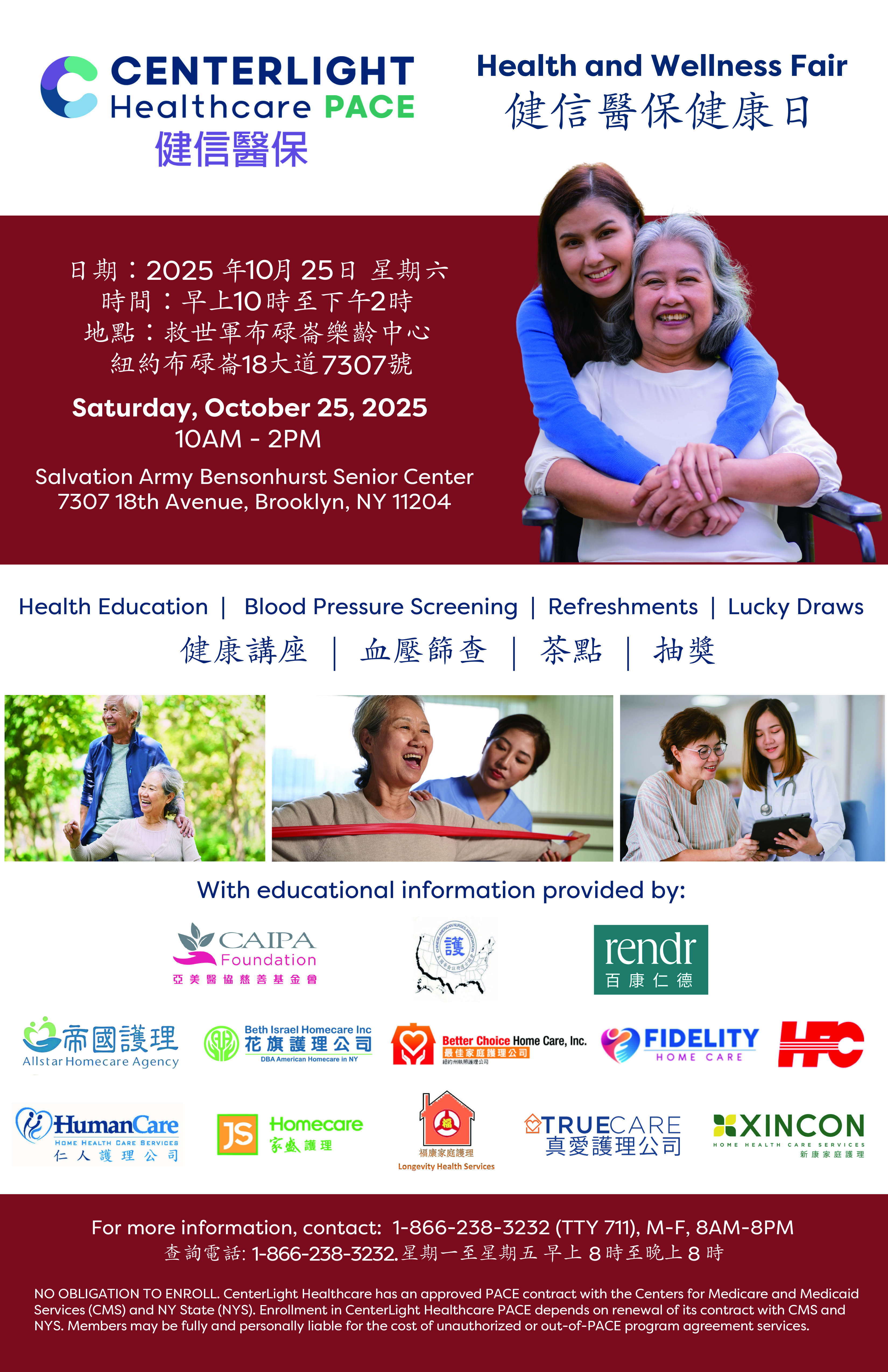 如您想参加 CenterLight 健信健康日活动,或有兴趣了解更多 CenterLight PACE 的信息,欢迎于星期一至星期五上午 8 点至晚上 8 点,拨打 1-866-238-3232 (TTY 711)查询。