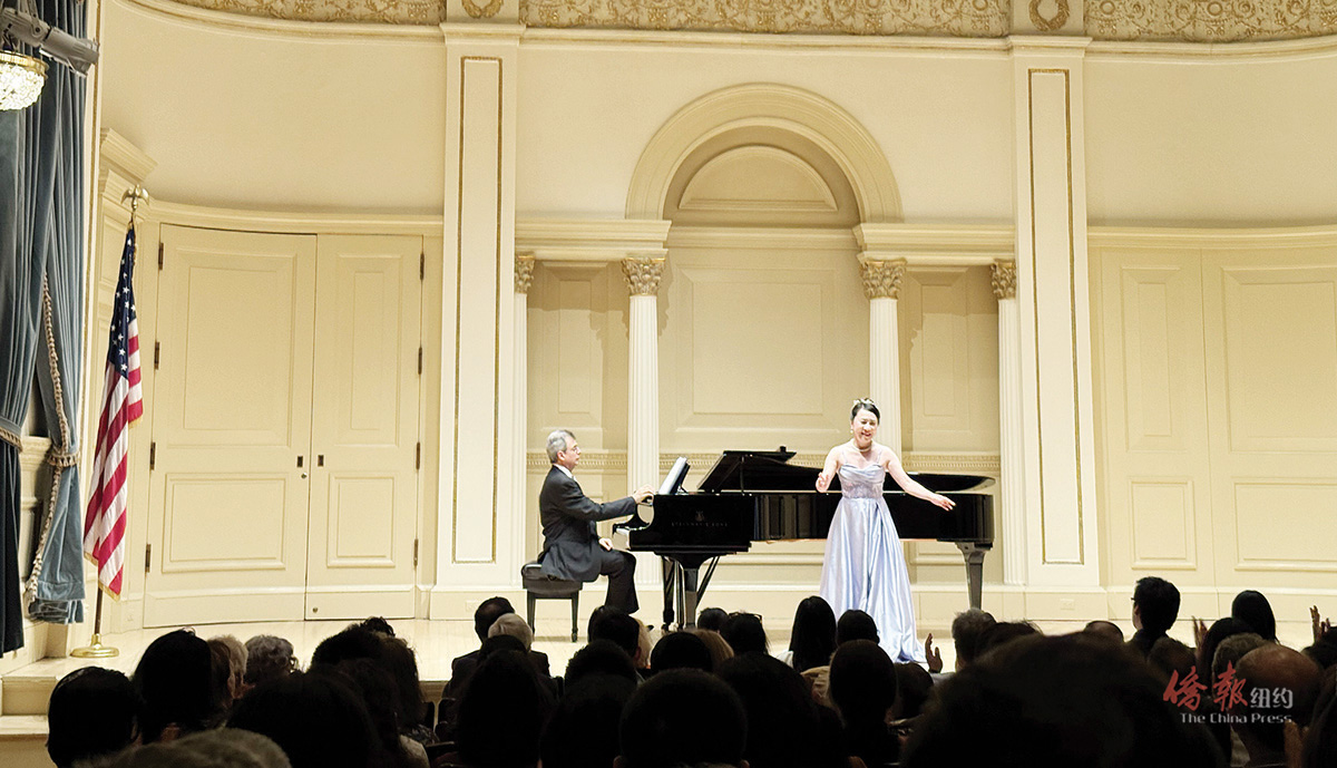 【侨报纽约讯】 华人女高音歌唱家叶纤与西班牙男高音歌唱家卡雷拉斯(Sergi Gimenez Carreras)19日晚在卡内基音乐厅威尔厅举办“歌剧之夜”音乐会(Elan Opera Night),为观众演绎多首西方经典歌剧的选段和百老汇剧的插曲。来自联合国和中国驻纽约总领馆的嘉宾及各界观众逾百人到场欣赏了音乐会。