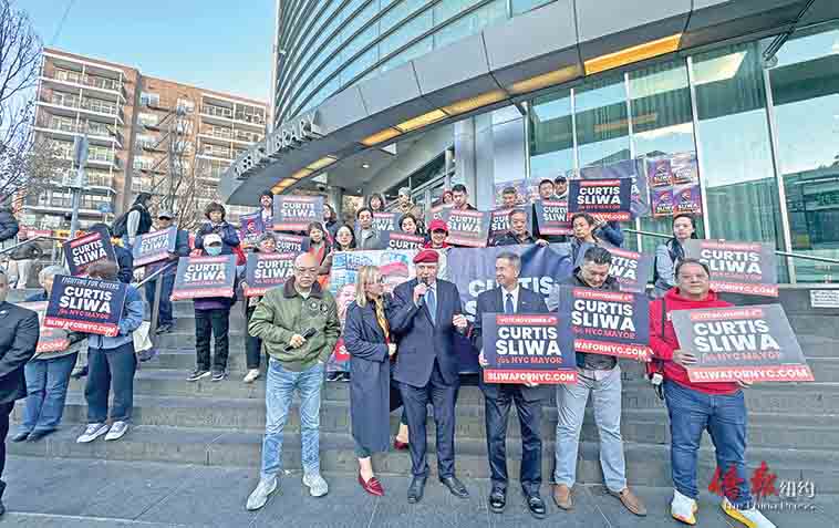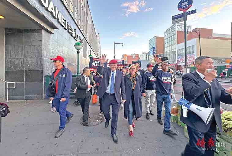 当天下午五点左右,共和党候选人斯利瓦(Curtis Sliwa)在其妻子Nancy Sliwa陪同下来到法拉盛图书馆门前举行集会,并在法拉盛街头走访社区商家,与民众互动。前市警局三星警司陈文业、前州众议员参选人廖安怡(Sharon Liao)、白正熩(Kenneth Paek)以及王绍权(Philip Wang)、前市议员参选人周国龙、“守护天使”法拉盛巡逻鹰队长暨梅逸咏春功夫馆负责人曾韶基等人士出席了集会。