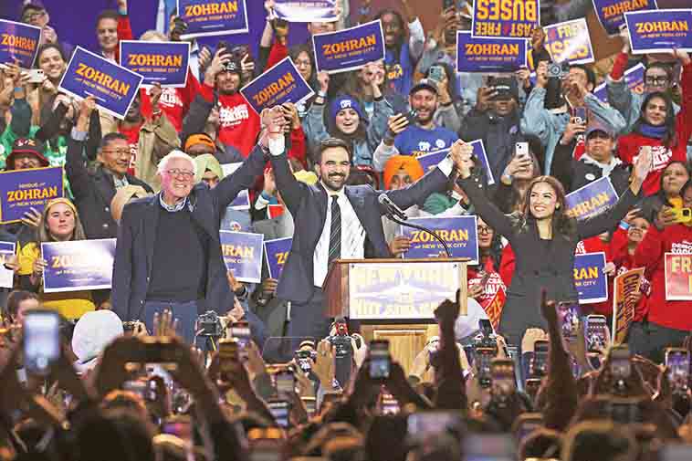 曼达尼周日晚间在皇后区森林小丘体育场出席盛大集会。(美联社)