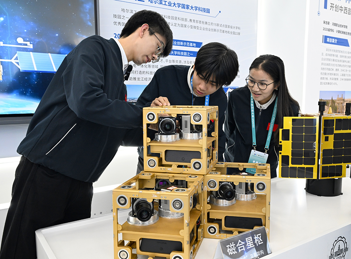 ▲10月15日,中国国际大学生创新大赛(2025)冠军争夺赛在河南郑州举办。图为在大学生创新成果展现场,哈尔滨工业大学代表在展示“磁合星枢——面向巨星座建设的新体制‘细胞’卫星平台”项目模型。新华社