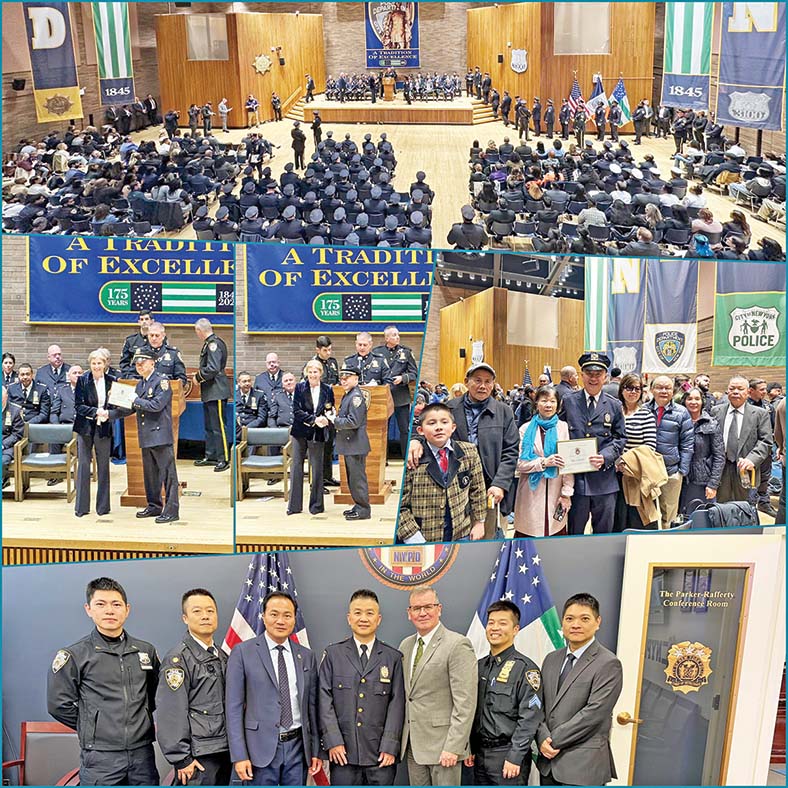 【侨报记者韩清湲10月30日纽约报道】纽约市警30日于曼哈顿市警总局举行升职典礼,市警局局长蒂施(Jessica S. Tisch)为逾百位晋升的警员颁发新职衔,其中两名华裔警官晋升高阶职位,市警罪案现场组(NYPD Crime Scene Unit)组长李本(Benjamin B Lee,音译)由副督察(Deputy Inspector)升至督察(Inspector),皇后区市警104分局张明恒(Ming H Zhang)由副警监(Lieutenant)升至警监(Captain) 。