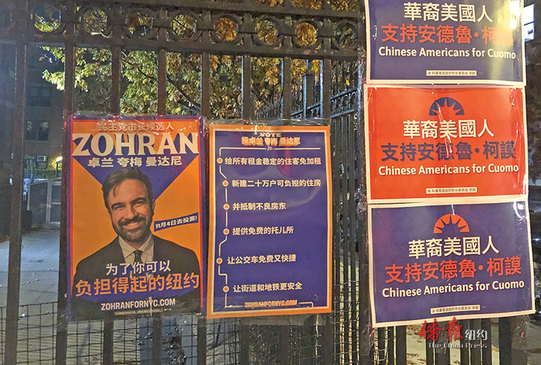 在日落公园六大道60街的永助圣母堂(OLPH)投票站外,支持曼达尼的一众华裔年轻人也不断向来往行人派发传单,用中英文宣传他的各项可负担政策。同个街角也张贴着不少力挺葛谟的海报和旗帜,让这个选举夜火药味十足。