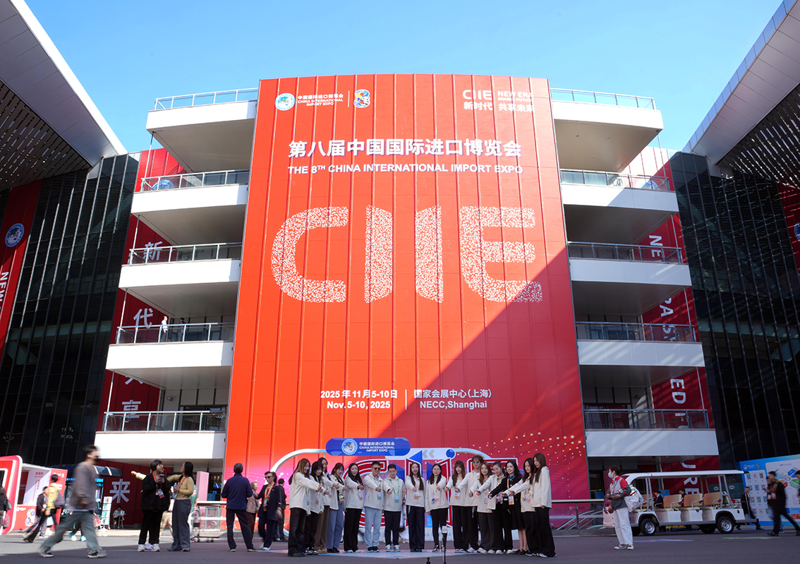 ▲11月10日,第八届中国国际进口博览会在国家会展中心(上海)闭幕。图为当日,人们在进博会巨幅标志前合影留念。新华社