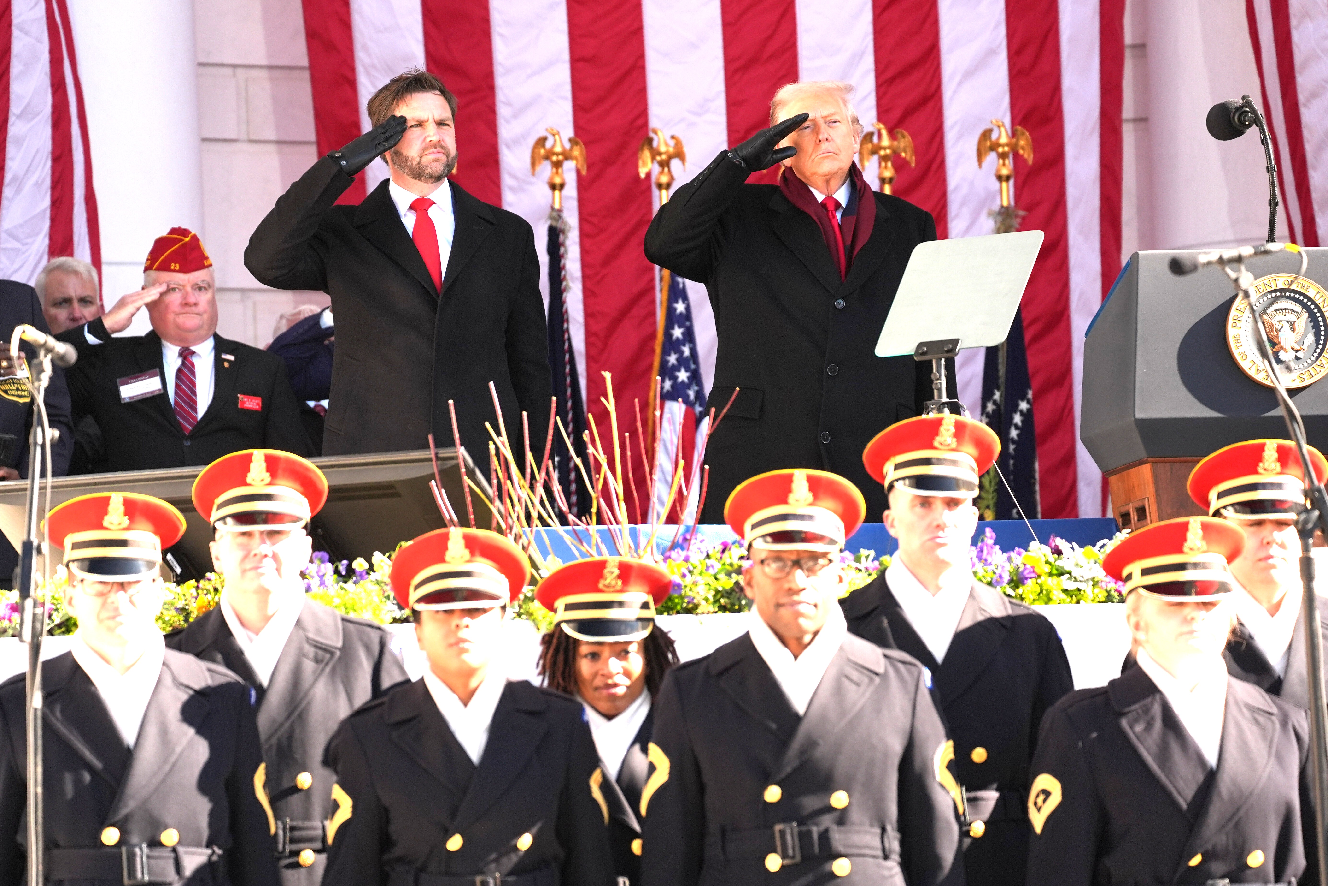 当天上午,特朗普与副总统万斯及老兵事务部部长柯林斯(Doug Collins)在无名战士墓前敬献花圈,仪式在寒风中进行,体感温度低于冰点,特朗普佩戴围巾与手套致敬。