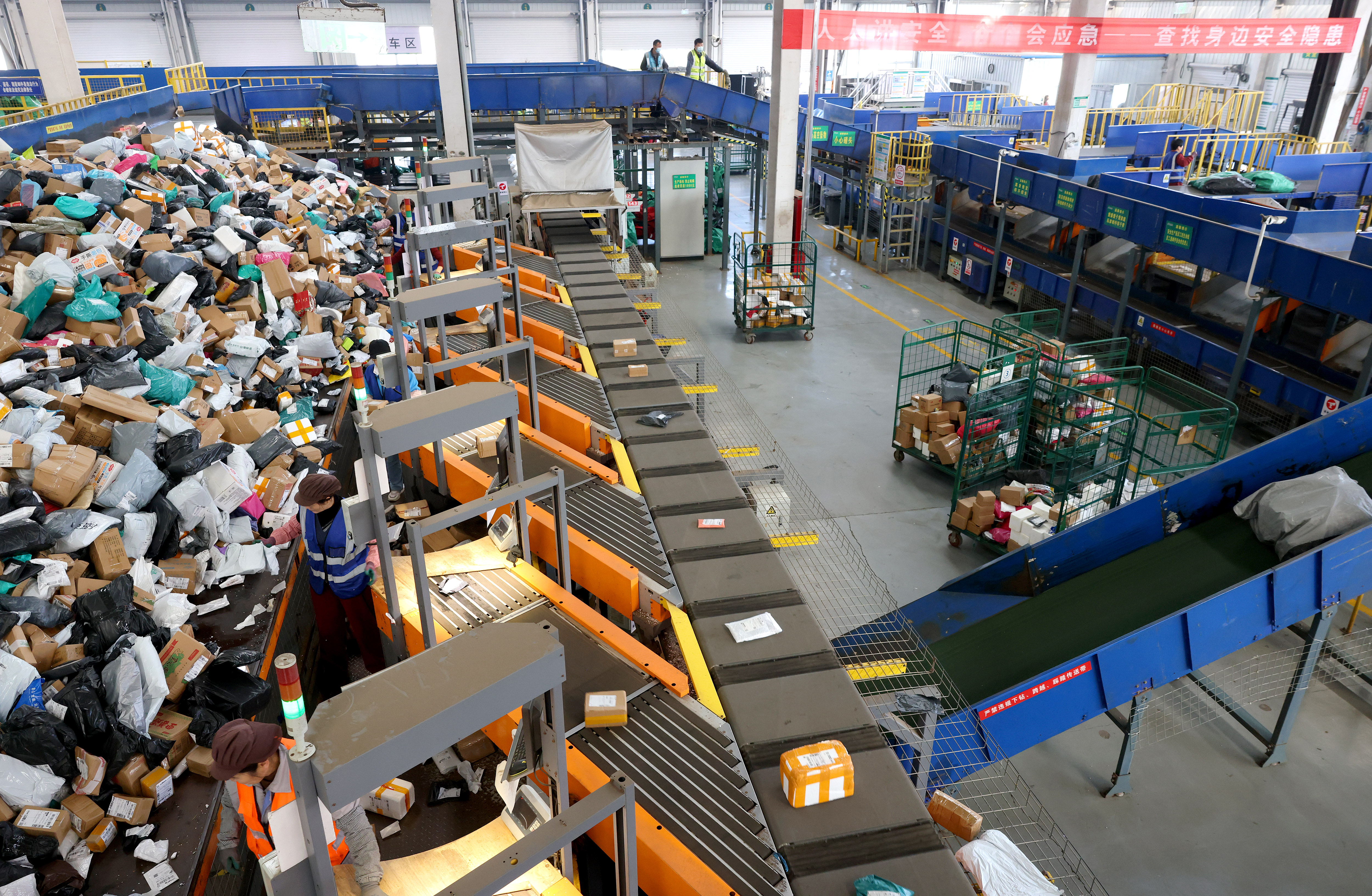 ▲11月10日,工作人员在中国邮政集团有限公司山东枣庄市分公司寄递事业部网路运营中心分拣快递。新华社