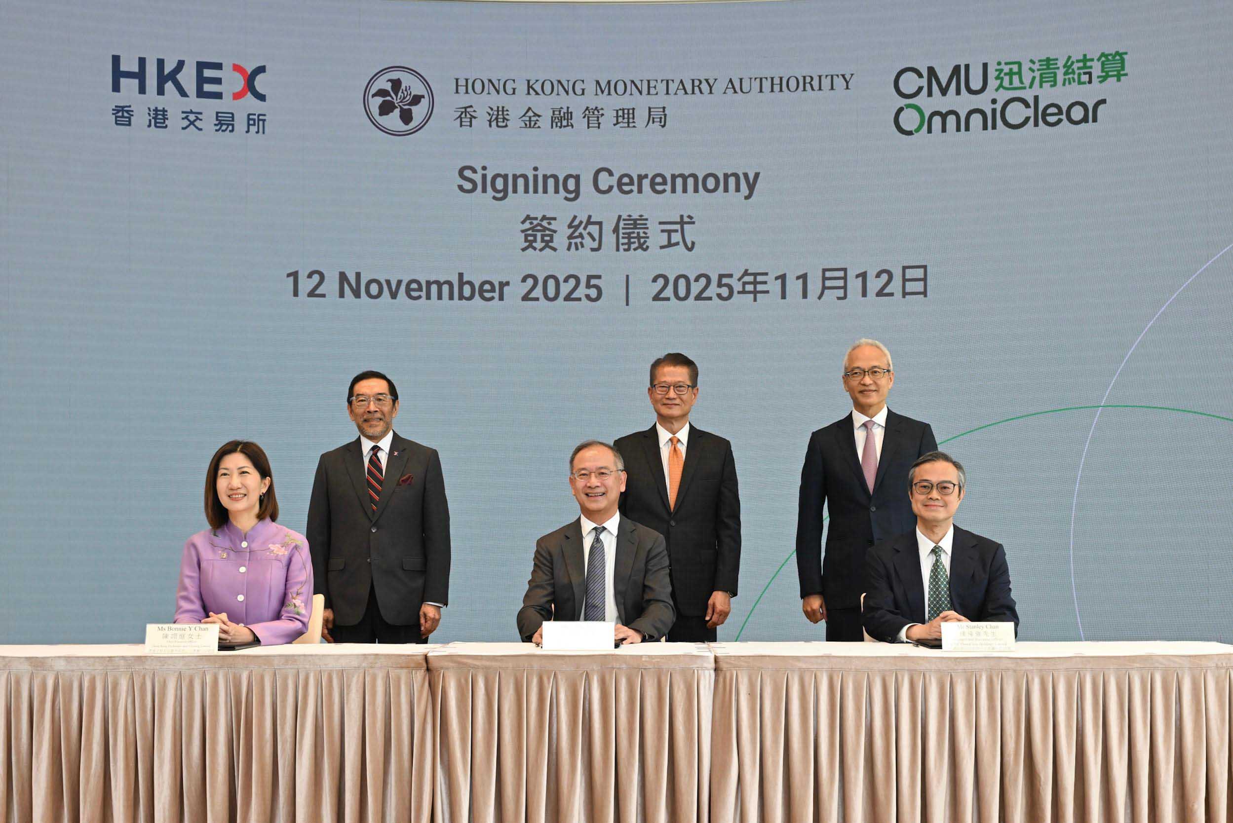 ▲11月12日,香港特区政府财政司司长陈茂波出席香港金融管理局、香港交易及结算所有限公司及迅清结算控股有限公司签约仪式。图为(后排左起)香港交易所主席唐家成、陈茂波司长和金管局副总裁及迅清结算控股副主席李达志见证(前排左起)香港交易所集团行政总裁陈翊庭、金管局总裁及迅清结算控股主席余伟文和迅清结算控股集团行政总裁陈达强签约。 香港中通社