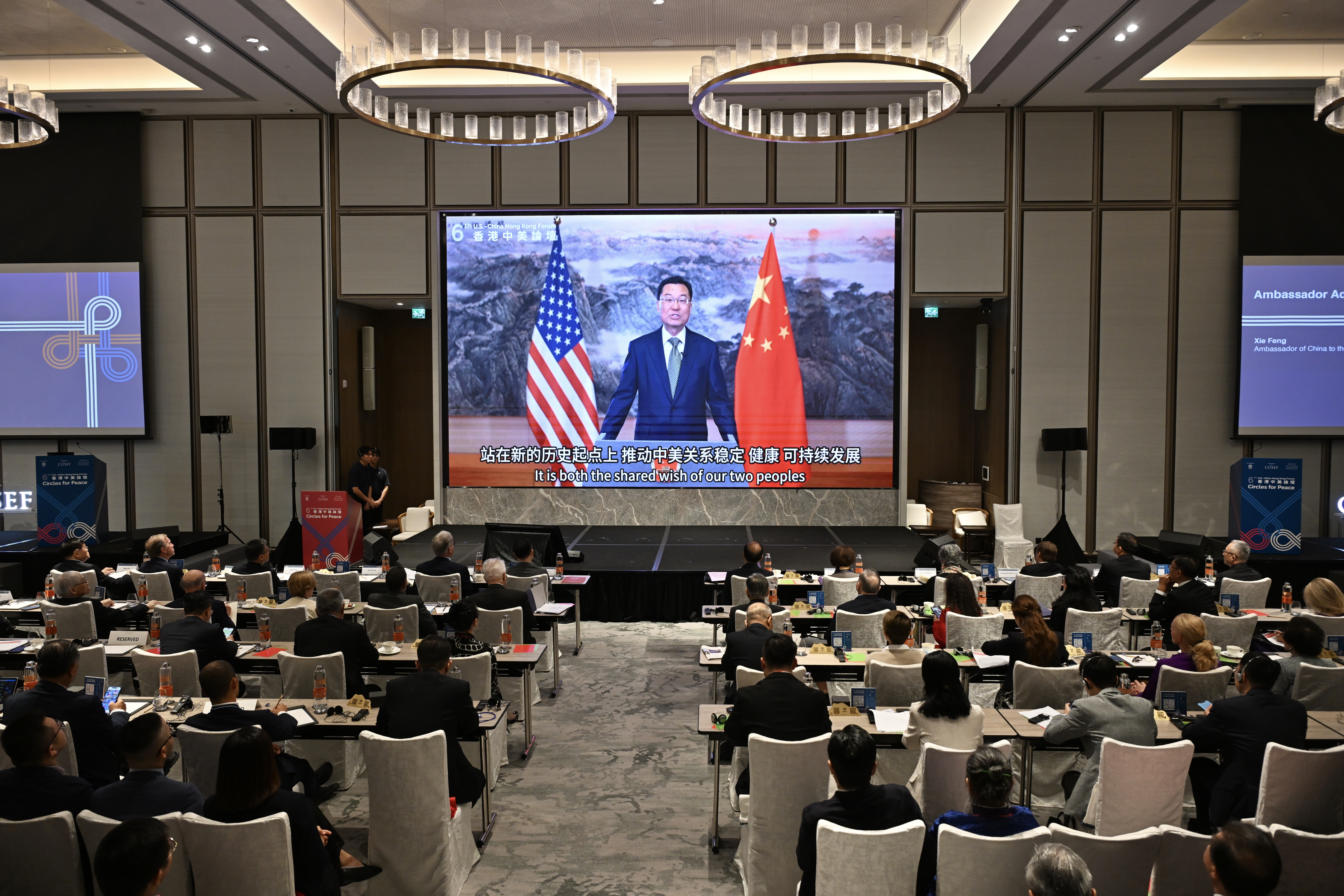 ▲11月17日,中美交流基金会和中国人民对外友好协会在香港举办2025年香港中美论坛。论坛以“共筑和平之环”为主题,中美各界代表350余人参加。图为中国驻美国大使谢锋应邀以视频方式发表致辞。中新社