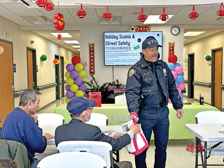 【侨报记者崔国萁11月24日纽约报道】布碌仑市警62分局联合华人健康协会和LCP本地巡逻队,于24日在宾臣墟区18大道举行了“节日安全与预防诈骗”讲座,主讲警官从实体购物到网上购物安全以及预防诈骗等,事无巨细地向民众传授各种预防之策,以助大家安全过节。