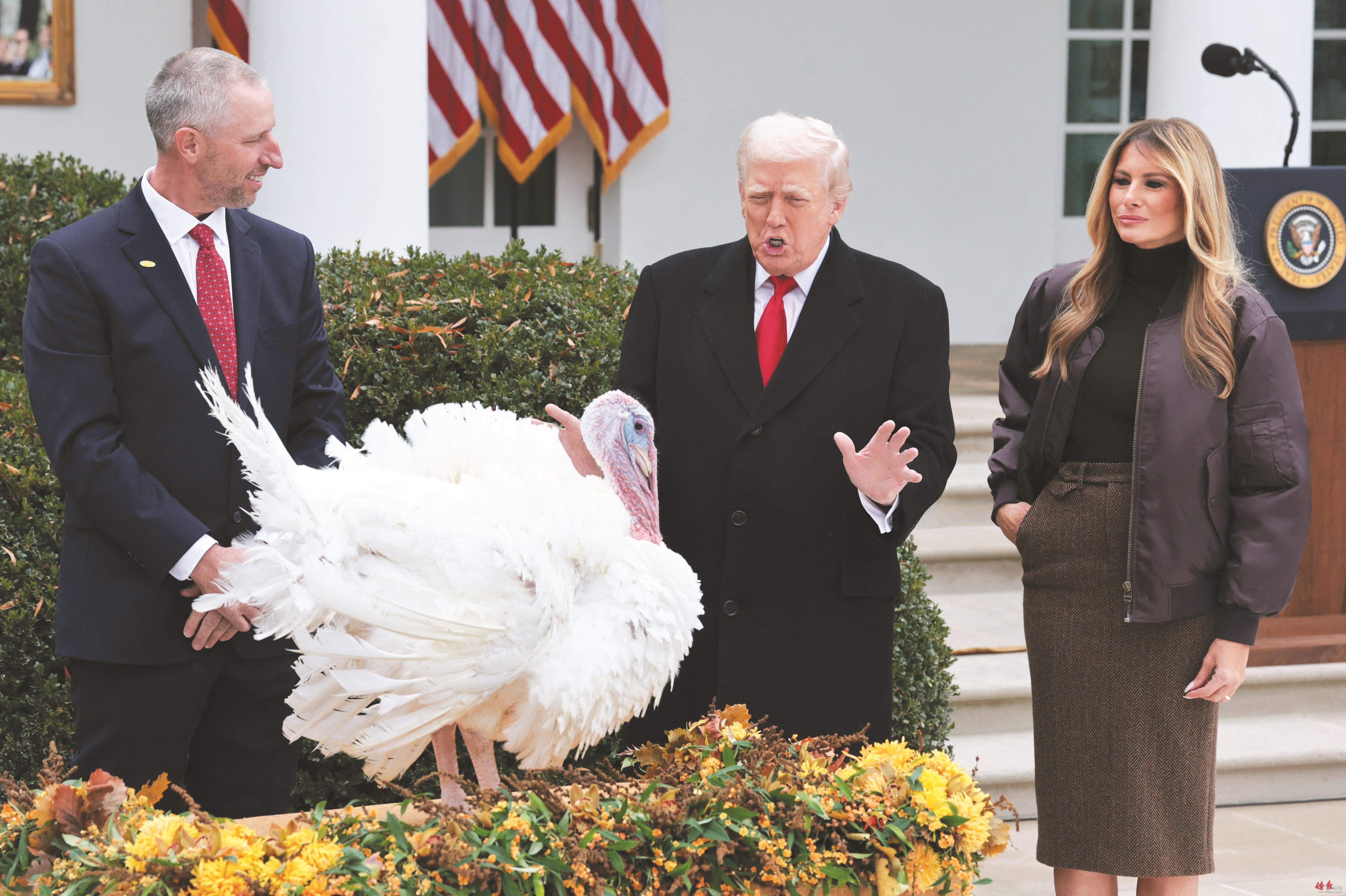 【侨报讯】11月25日美联社报道,总统特朗普当天在白宫举行感恩节火鸡赦免仪式,两只名为“咯咯”(Gobble)与“晃晃”(Waddle)的火鸡正式获赦。但这场通常轻松幽默的年度传统,被特朗普密集的政治调侃与尖锐嘲讽彻底“点燃”,更像是一场即兴的政治秀。
