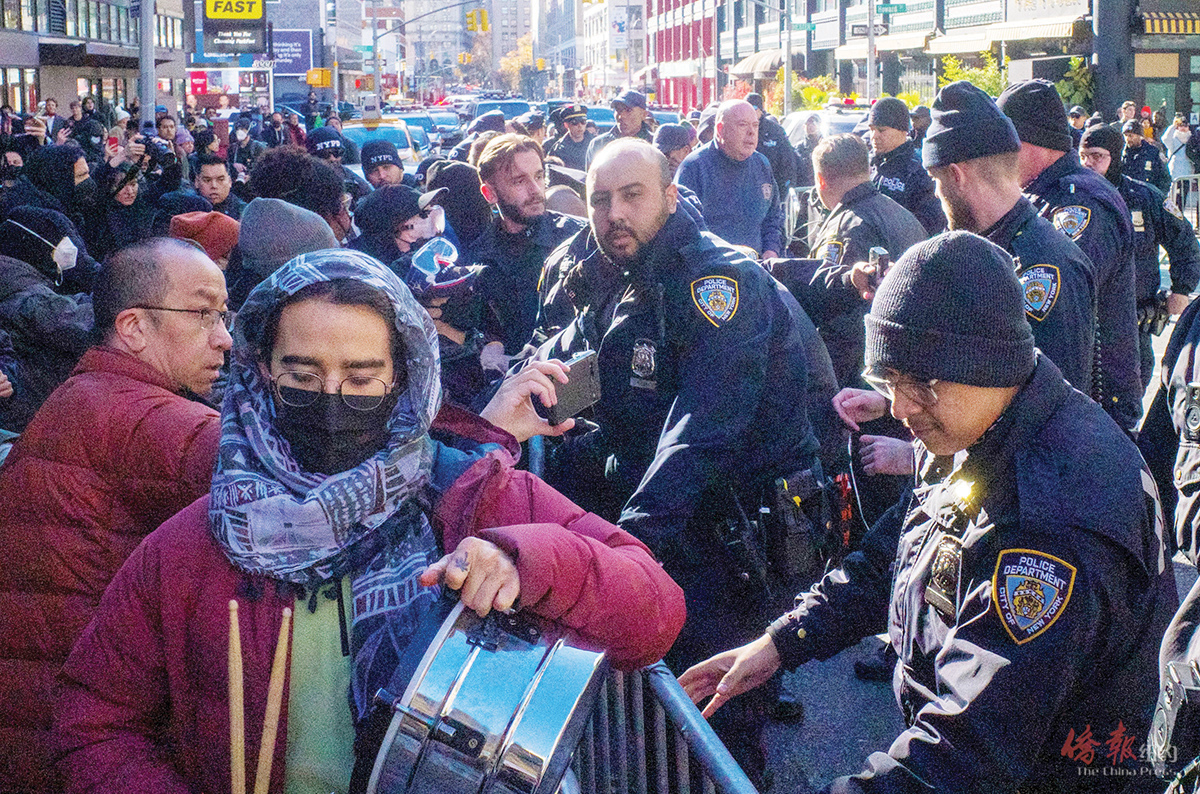 警方上周末在华埠街头应对阻止ICE抓捕行动的抗议者。 (路透社)