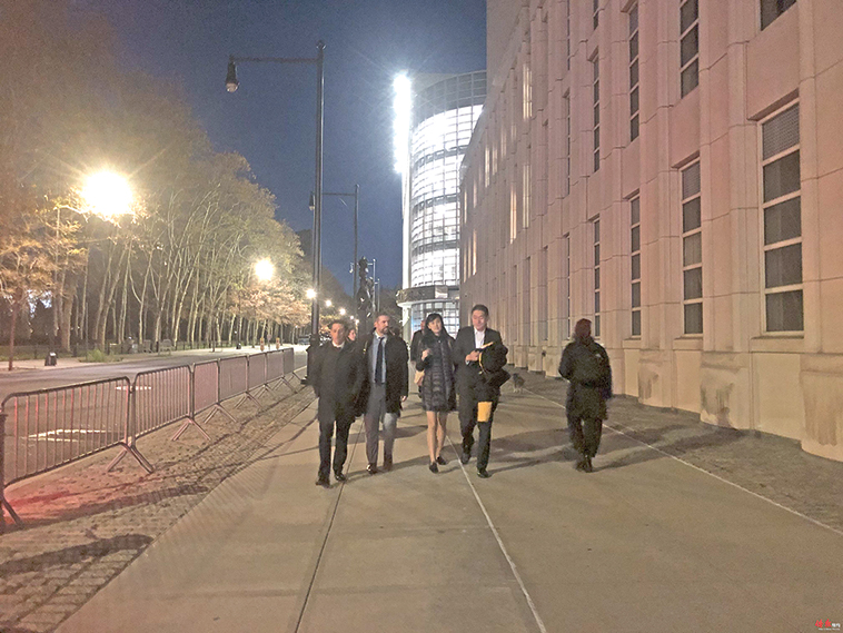 孙雯胡骁夫妇日前在辩护律师团陪伴下离开法庭。 (高诗云摄)