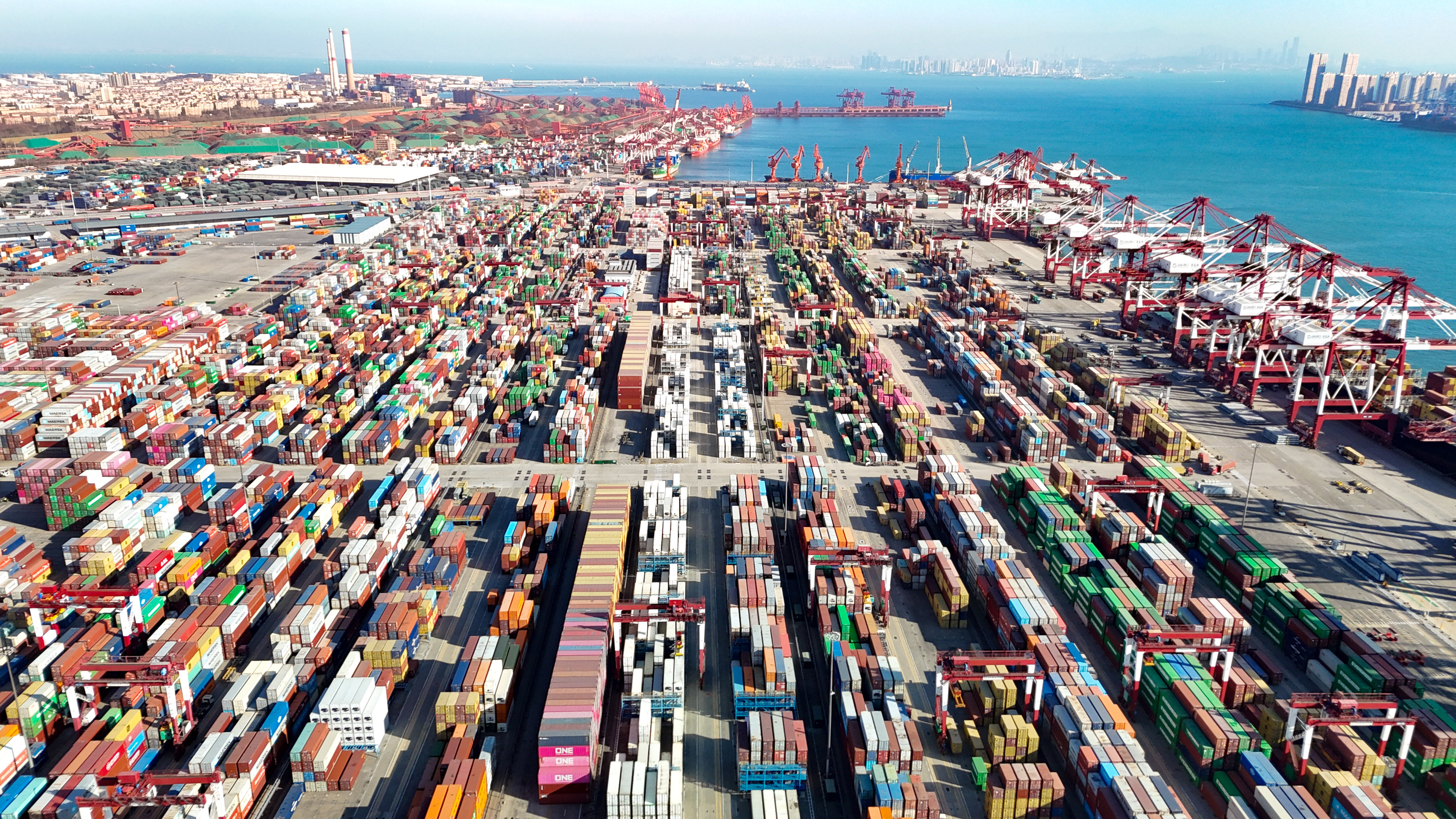 ▲12月8日,山东青岛,随着“地中海伊娃”轮在前湾港区完成装卸作业,青岛港今年货物吞吐量累计突破7亿吨,较2024年突破7亿吨提前15天。图为青岛港集装箱堆场。中新社
