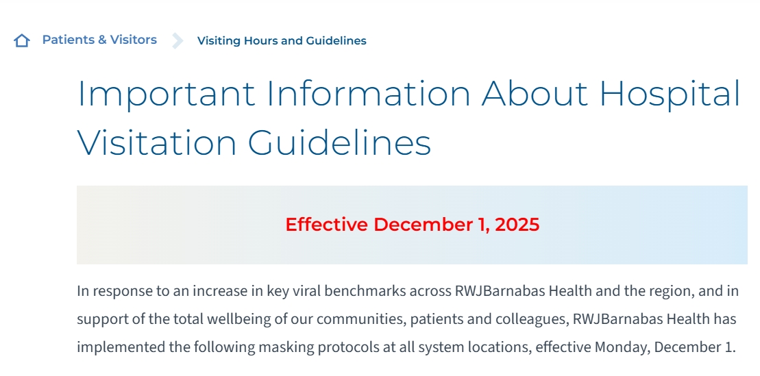 本周,新泽西州规模最大的两家医院系统Hackensack Meridian Health(拥有18家医院)与RWJ Barnabas Health(运营14家医院)先后宣布,自2025年12月1日起,在所有住院机构内重新实施口罩要求。并在各自主页明确要求和规定。