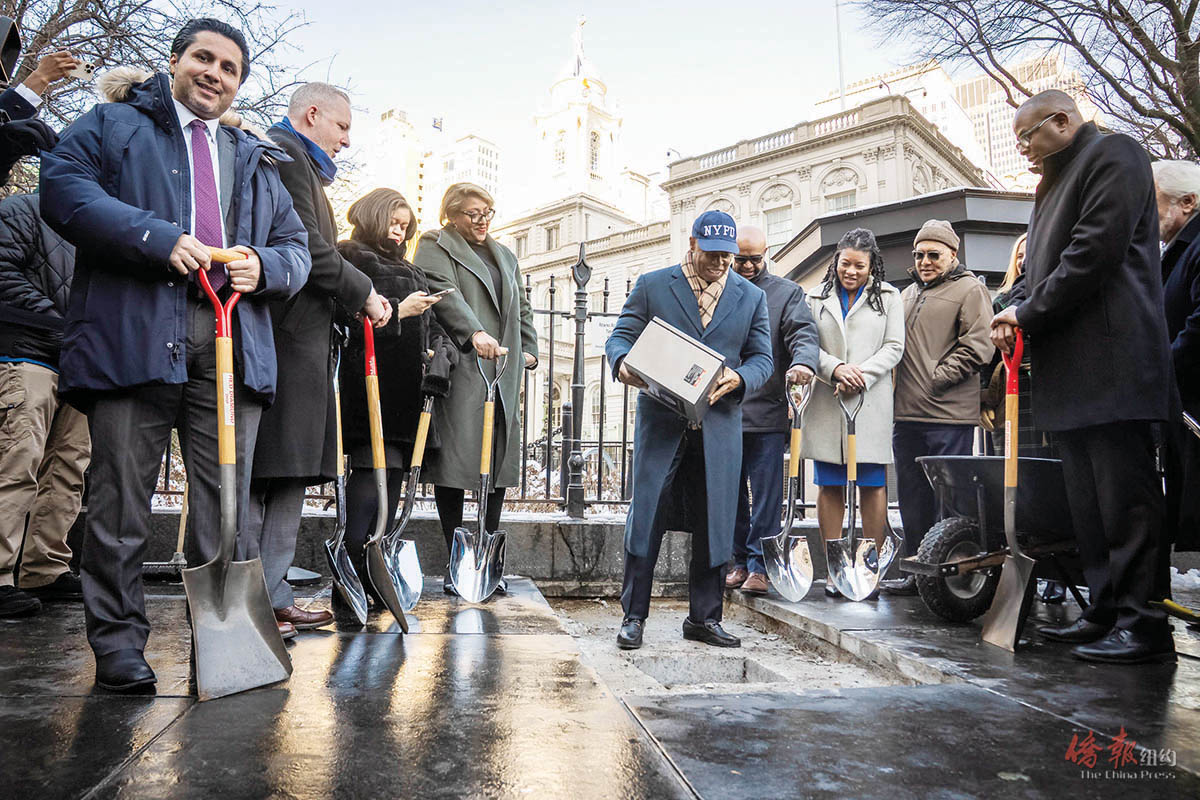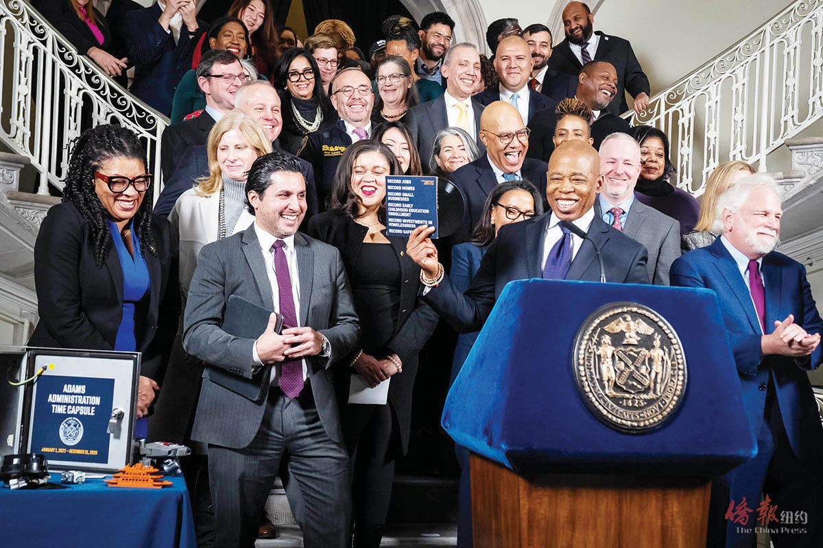 【侨报记者管黎明12月16日纽约报道】继周一的少数族裔社区媒体圆桌会之后,市长亚当斯周二(16日)携手数十名市府各部门主管在市政厅内举行了一场具有告别意味的“任期工作总结”记者会,除强调过去四年的政绩外,他还要求各部门提供一件象征性的物品做成“时间胶囊”,在记者会结束时将“胶囊”掩埋在了市府外面的公园内。亚当斯于周二当晚便前往墨西哥,开启一趟“私人行程”。