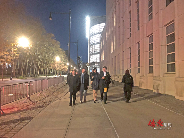 孙雯胡骁夫妇在辩护律师团陪伴下离开法庭。( 高诗云摄)