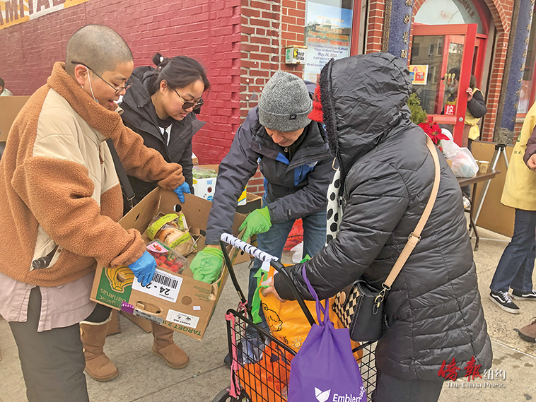 【侨报记者高诗云12月25日纽约报道】布碌仑市议员庄文怡(Susan Zhuang)与州众议员寇顿办公室,携手普陀山纽约梵音寺、联合亚美联盟(UA3)及华人社区服务中心,于25日圣诞节当天在八大道华社举行新鲜食品免费派发活动,将超过300份蔬果和面包送到需要帮助的居民手中,传递节日的温暖。
