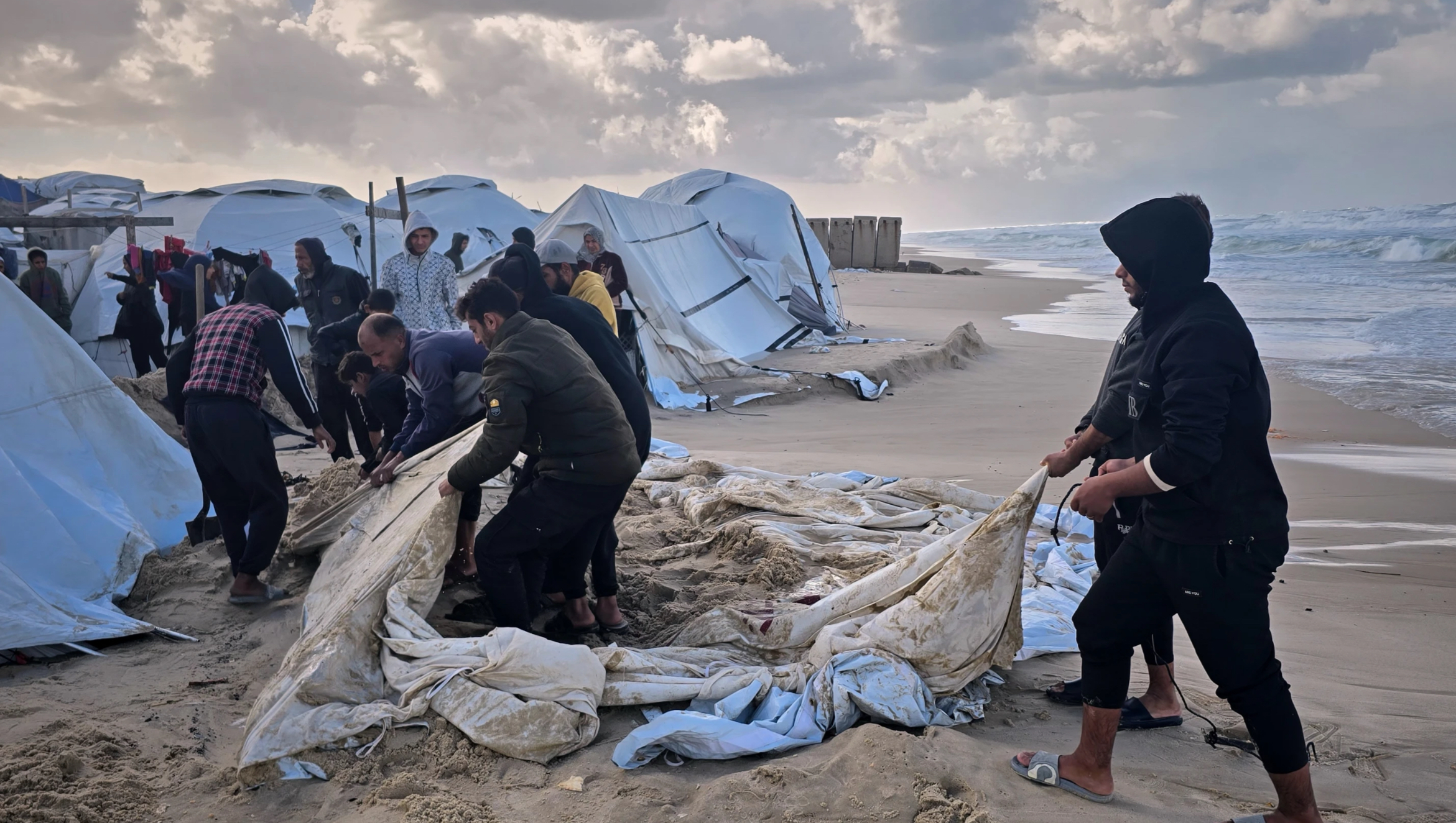 “到处都是水洼,还有难闻的气味,”从加沙南部拉法(Rafah)流离失所的马吉杜琳·塔拉贝因说,“帐篷被风吹走了,我们不知道该怎么办,也不知道该去哪里。”她和家人只能用手拧干沾满泥水的毯子。