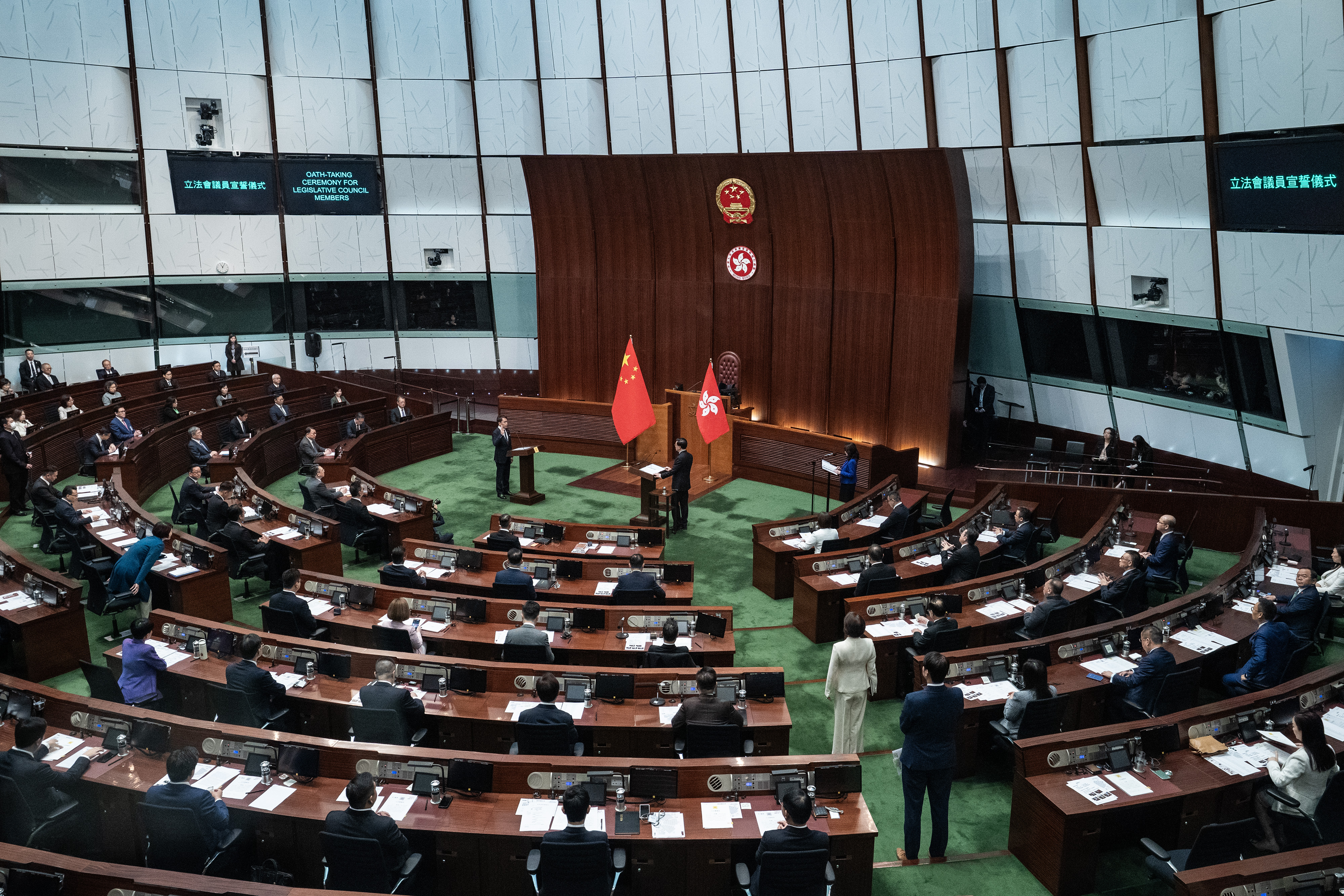 这是完善香港特区选举制度后产生的第二届立法会。当日上午,宣誓仪式在立法会综合大楼会议厅举行,国徽和区徽高悬主席台上方,下方分别树立着国旗与区旗,宣誓席与监誓席相向而立。