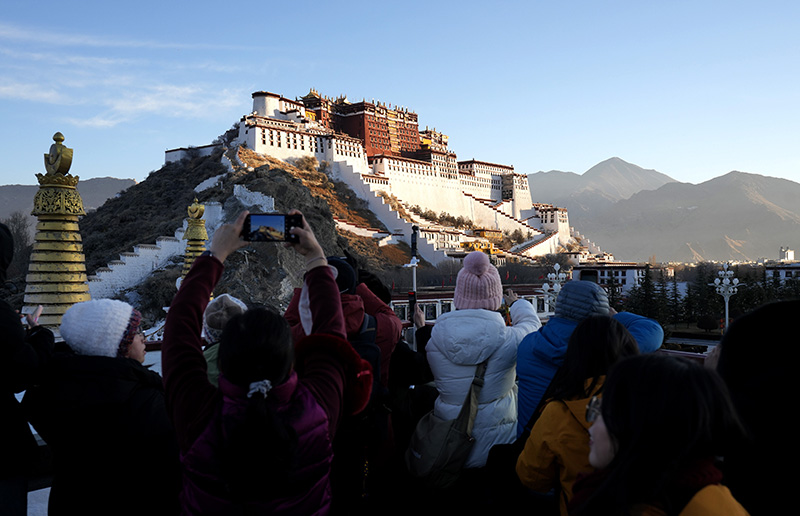 ▲2026年1月1日,游客在西藏拉萨药王山观景台拍摄清晨的布达拉宫。中新社