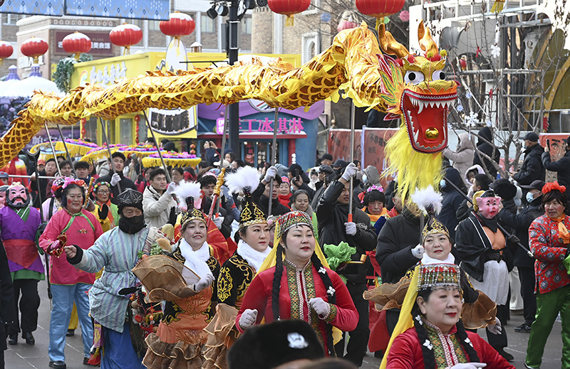 ▲新年第一天,乌鲁木齐市天山区“打起手鼓舞起龙”新年社火闹巴扎活动在大巴扎步行街举办,吸引游客和市民参与其中,热热闹闹迎接新年的到来。 新华社