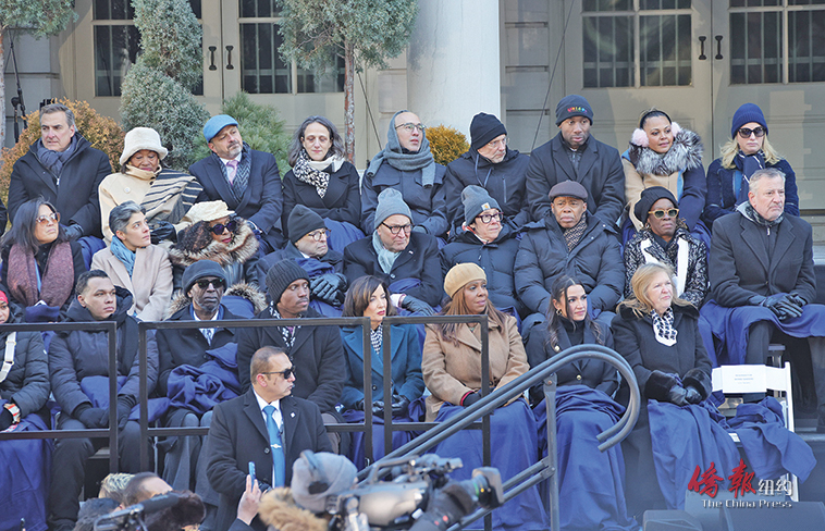 前市长亚当斯和白思豪、州长霍楚和检察长詹乐霞、国会议员桑德斯和欧凯秀等出席典礼。(管黎明摄)
