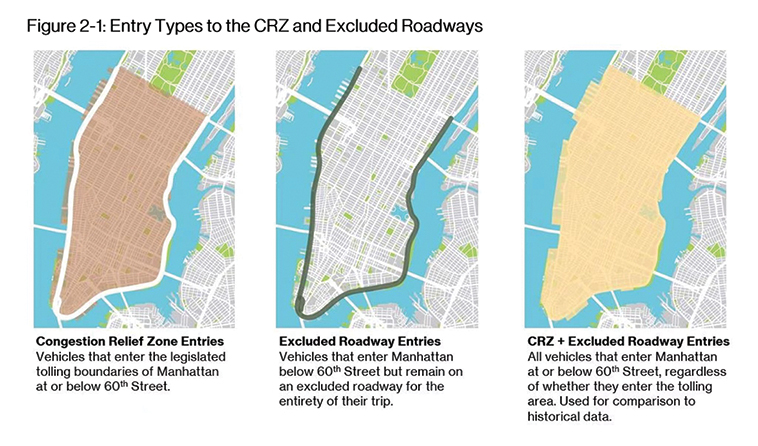 曼哈顿60街以下收费区域图。中间图显示东西两边高速路段(绿色)虽在60街以下,但属非收费区。(MTA)