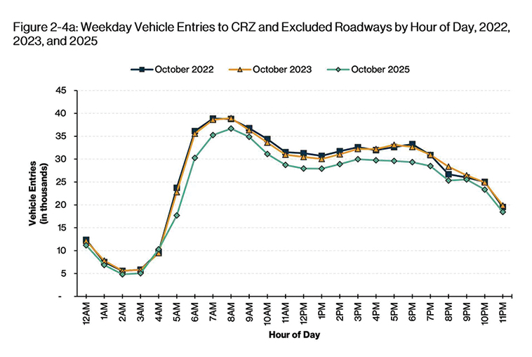 2022、2023和2025年十月份平均每天不同时段的交通流量对比图。绿色为2025年10月。(MTA)