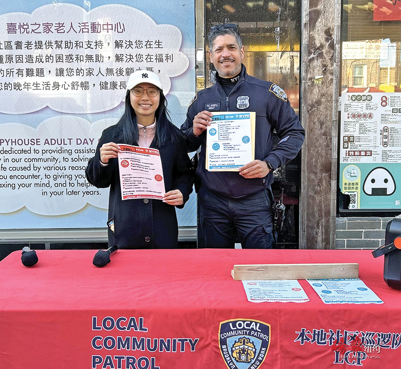 62分局警员阿科斯塔(右)提醒民众防范电话诈骗。(华康会提供)