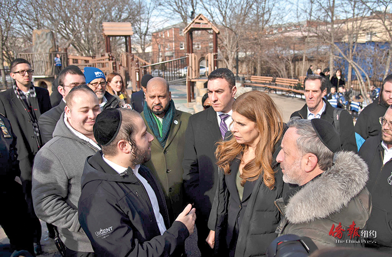 【侨报记者高诗云1月22日纽约报道】毗邻华社的布碌仑区公园(Borough Park)本周接连发生反犹仇恨事件,多名年轻恶徒用红色和蓝色油漆在公园内涂画了57个纳粹万字符和希特勒的名字,消息一出震惊社区。新任市议长朱曼宁(Julie Menin)与市议员迪诺维茨(Eric Dinowitz)22日与社区成员一道视察了事发地点,谴责这些仇恨行为并强调教育的重要性。