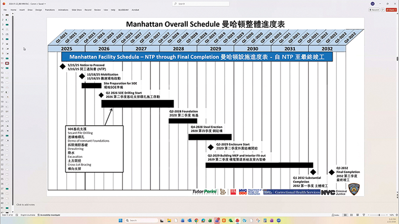 【侨报记者韩清湲1月22日纽约报道】市建筑设计局(DDC)联合市长刑事司法办公室市(MOCJ)、市惩教署 (DOC)以及华埠监狱设计建造团队22日于线上举行第三场华埠监狱社区设计研讨会,就华埠监狱的施工进行详解。会上众多居民就施工噪音和空气污染监测、施工时间持续至深夜是否会扰民、对于松柏大厦的墙体安全影响等问题表达担忧。