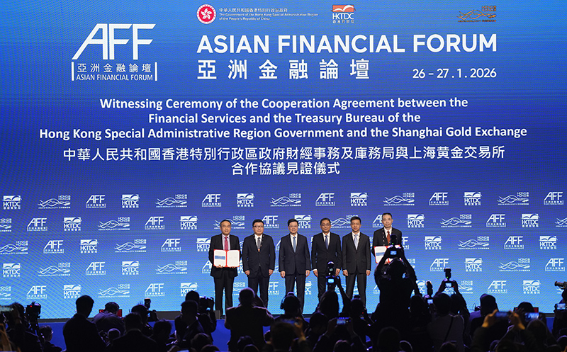 ▲1月26日,第十九届亚洲金融论坛在香港会议展览中心举行。图为论坛期间举行香港特区政府与上海黄金交易所合作协议见证仪式。香港中通社