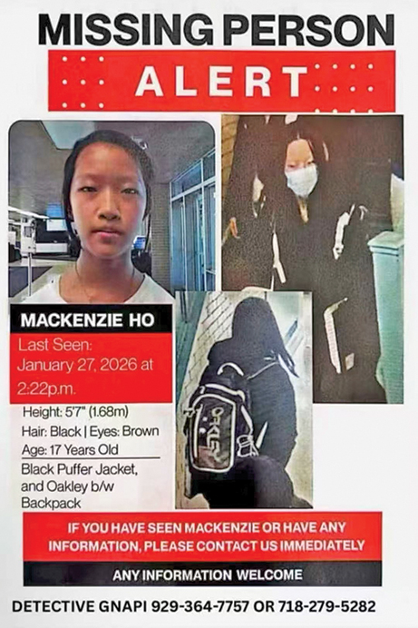 【侨报记者韩清湲1月29日纽约报道】就读于纽约皇后区法兰西斯路易斯高中(Francis Lewis High School)12年级的17岁华裔女学生何麦肯齐(Mackenzie Ho)27日(周二)下午离校后失联,家属及学校师生呼吁民众协助提供线索寻人。