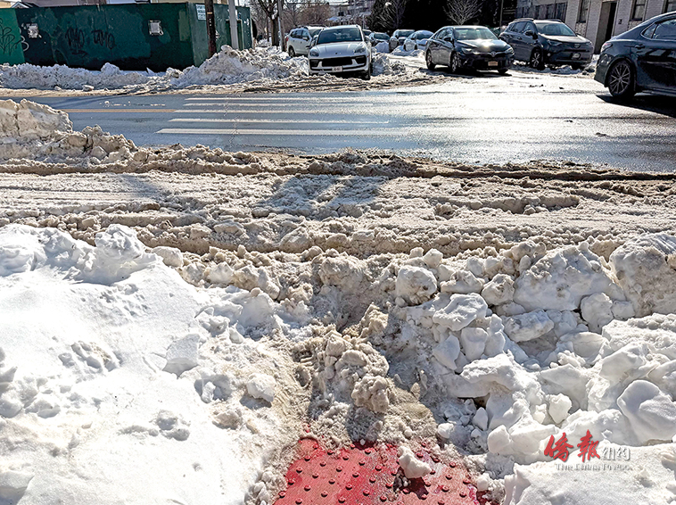 每天有大量华人使用的西鲁公园(Seth Low Playground)附近的史迪威大道(Stillwell Ave)交P大道,在暴风雪过后本就积下很多雪,后来铲雪车又将铲下的雪堆在路口和马路旁,加上处处融化的雪水,令民众过马路时举步维艰。